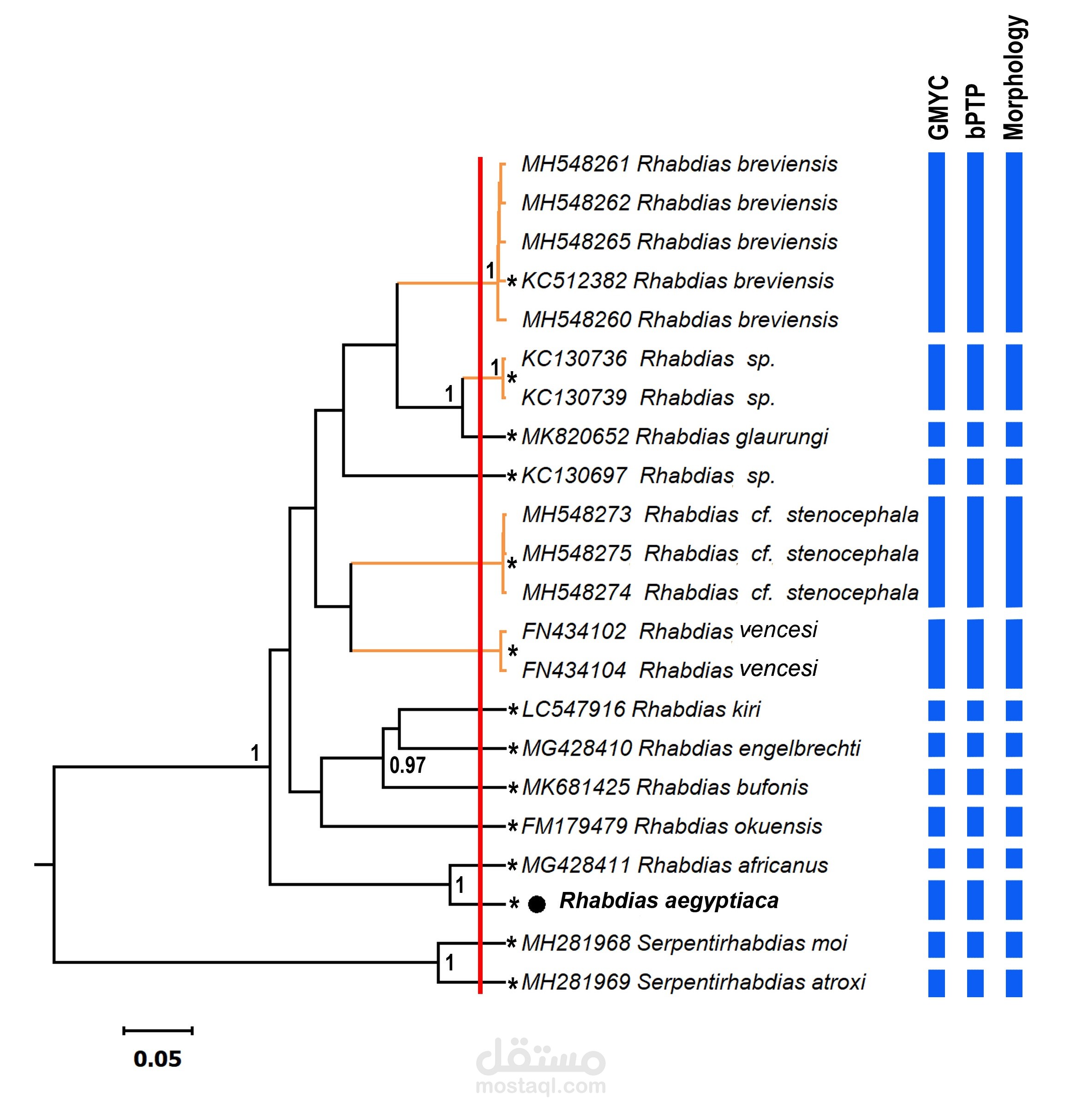 -التأكيد الجيني والجزيئي: تم تأكيد تحديد النوع عبر تحليل الاختلاف الجيني )Genetic Divergence(، و التحليل الفيلوجيني )Phylogenetic Analysis(، و تحليلات تحديد الأنواع )Species Delimitation(.
