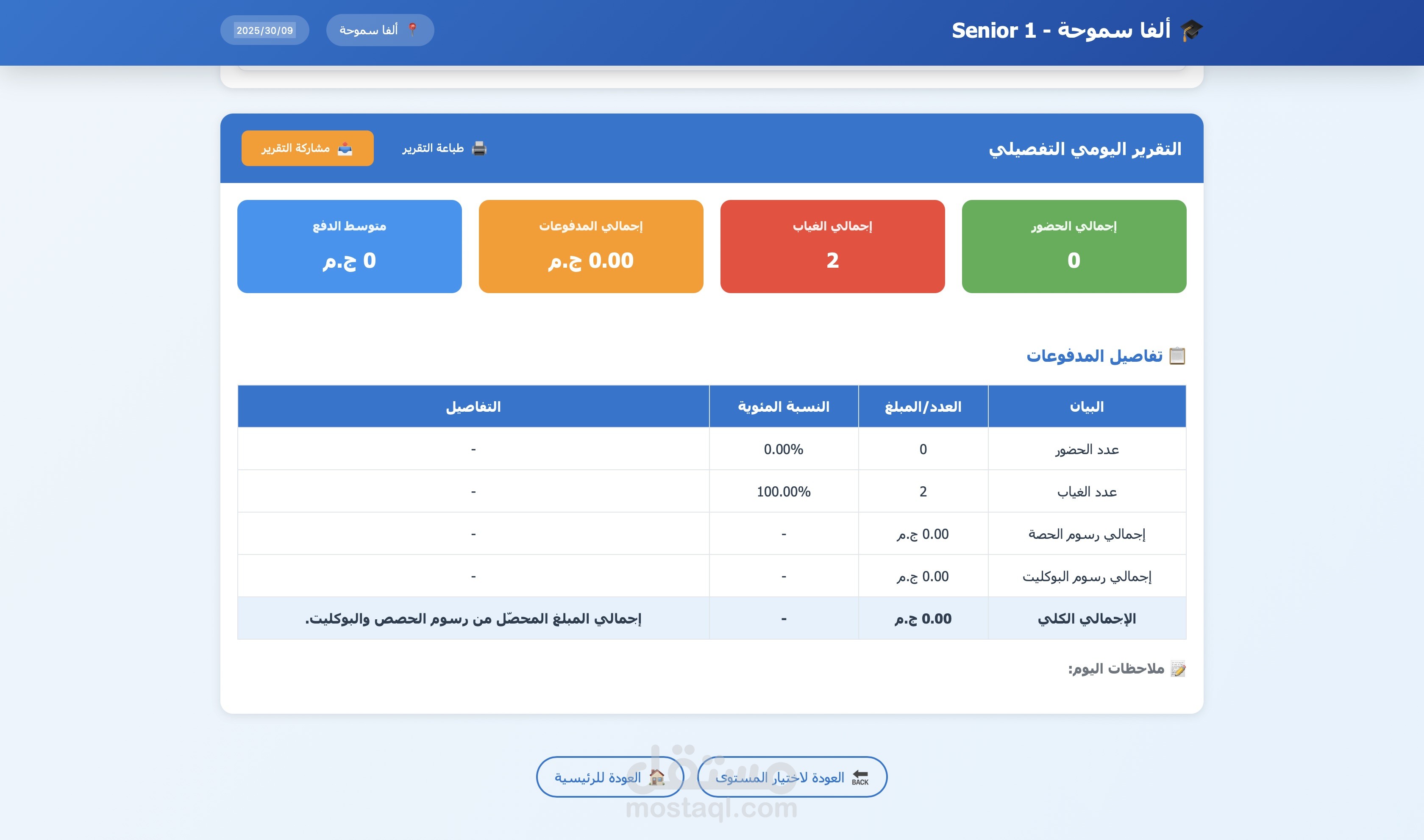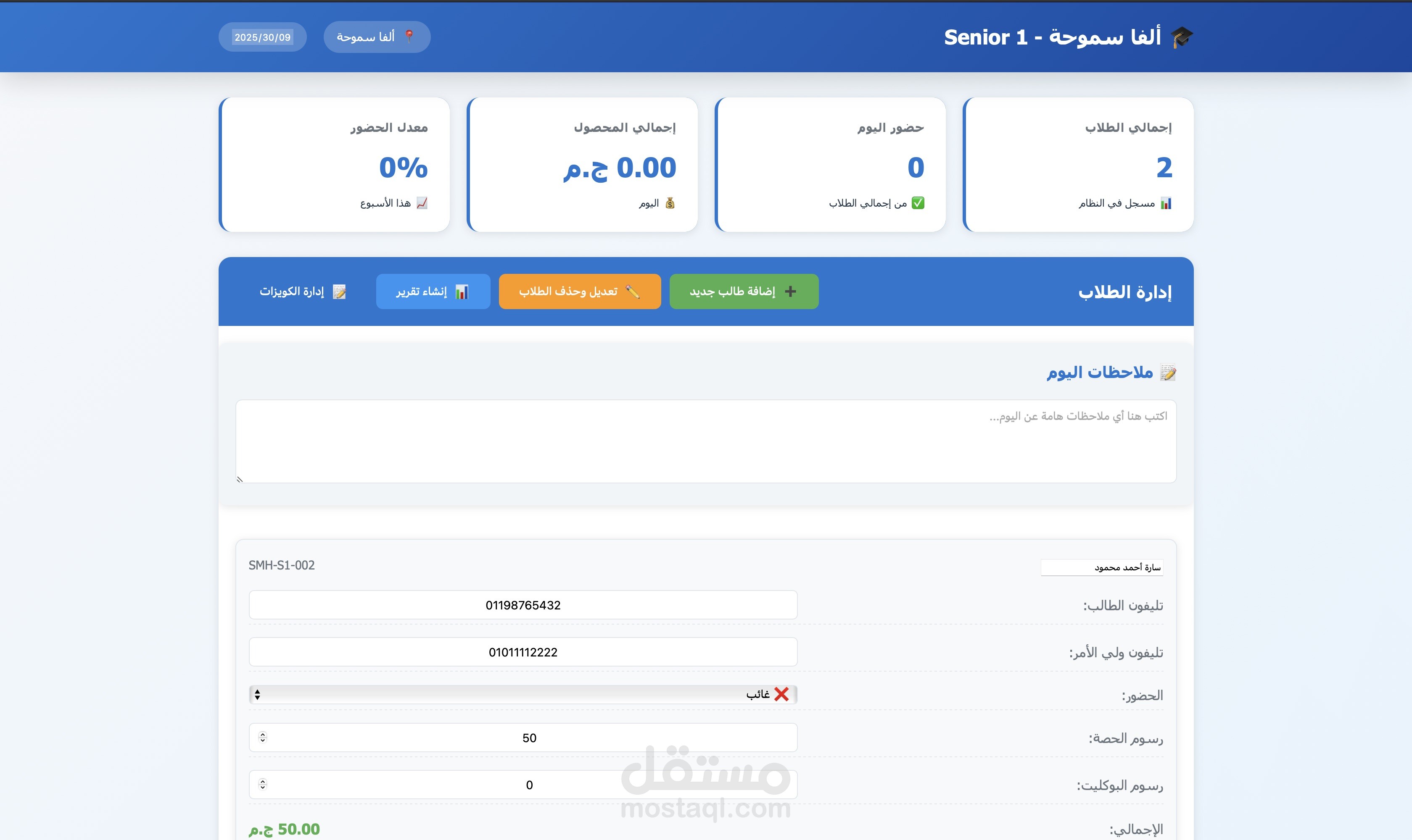 تسجيل سريع ودقيق: تسجيل الحضور والغياب وتسجيل المدفوعات (رسوم الحصة ورسوم البوكليت) بلمسة واحدة.