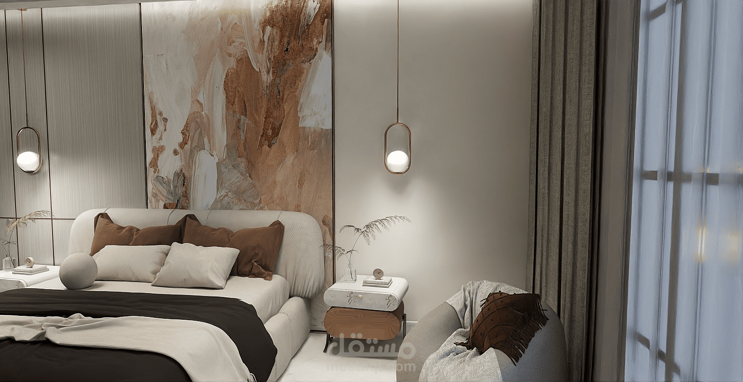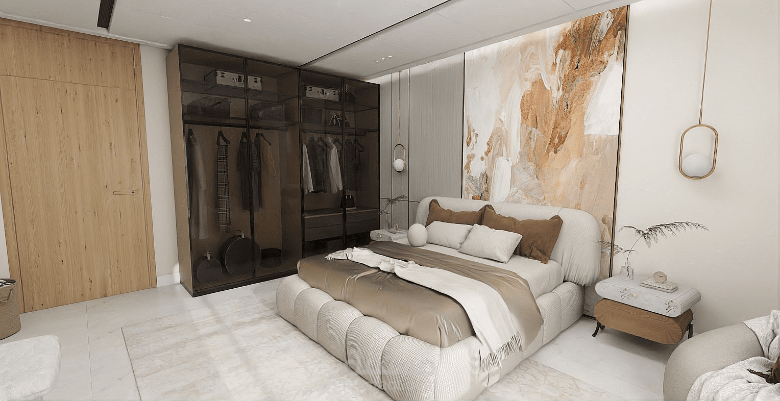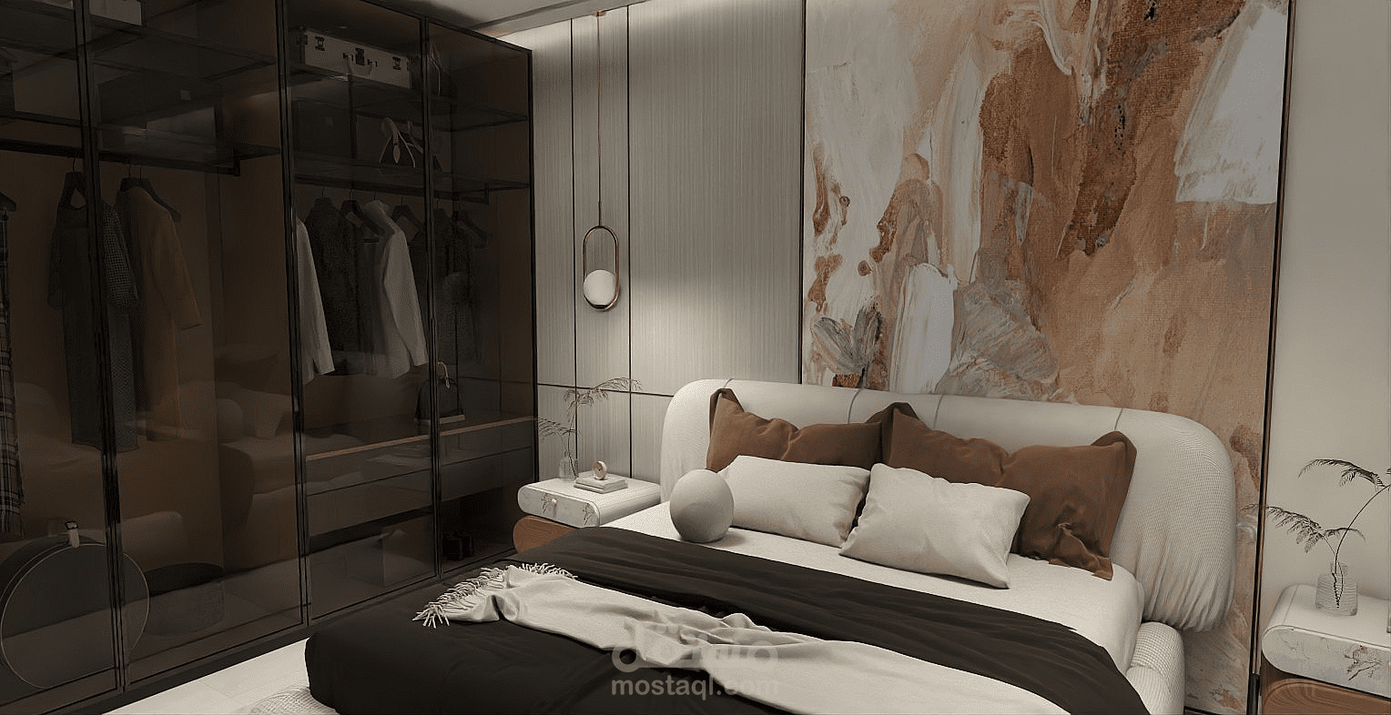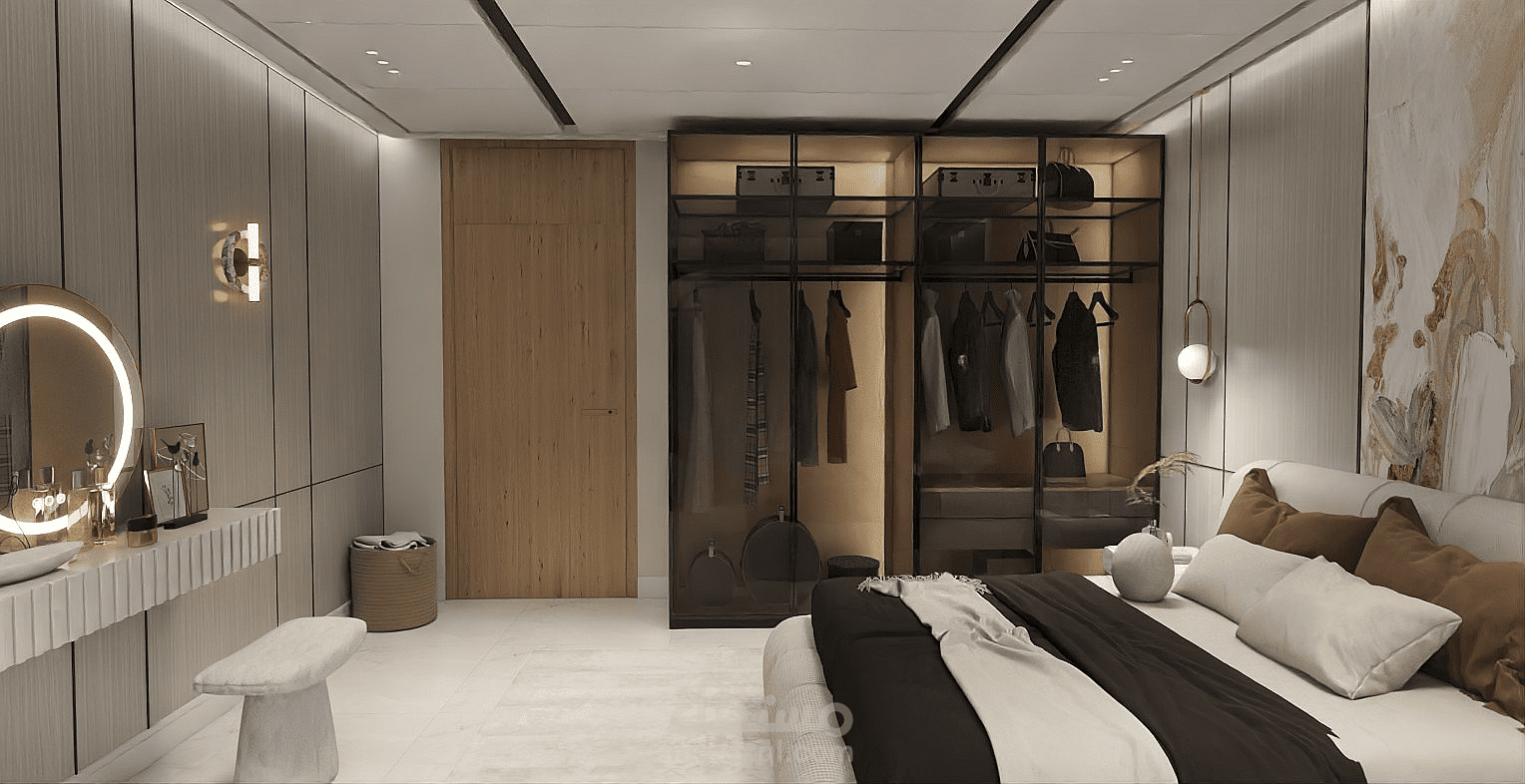 A cozy and modern bedroom featuring a comfortable bed with soft bedding and pillows. The room includes a wardrobe for storage and a nightstand beside the bed. Neutral wall colors create a calm atmosphere, and a window allows natural light to brighten the space. The lighting is warm, making the room relaxing and suitable for rest