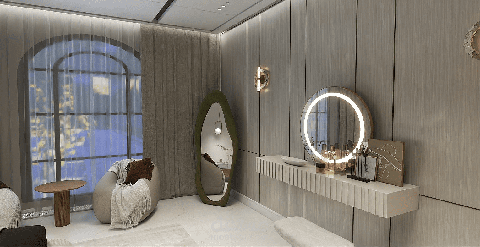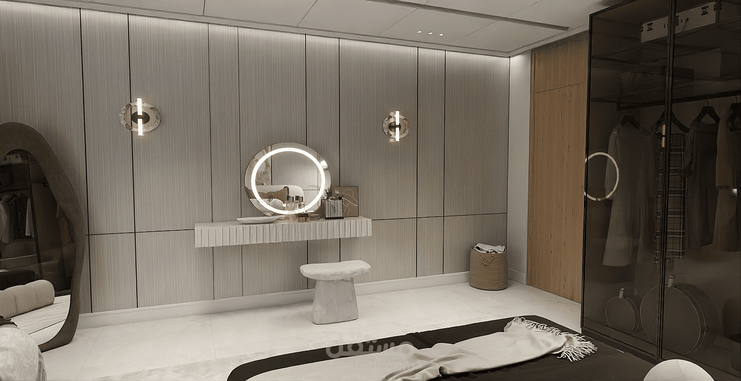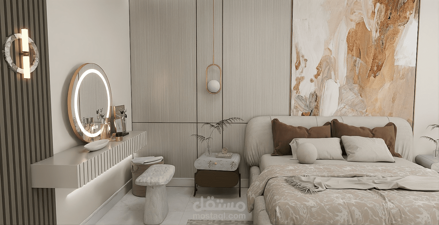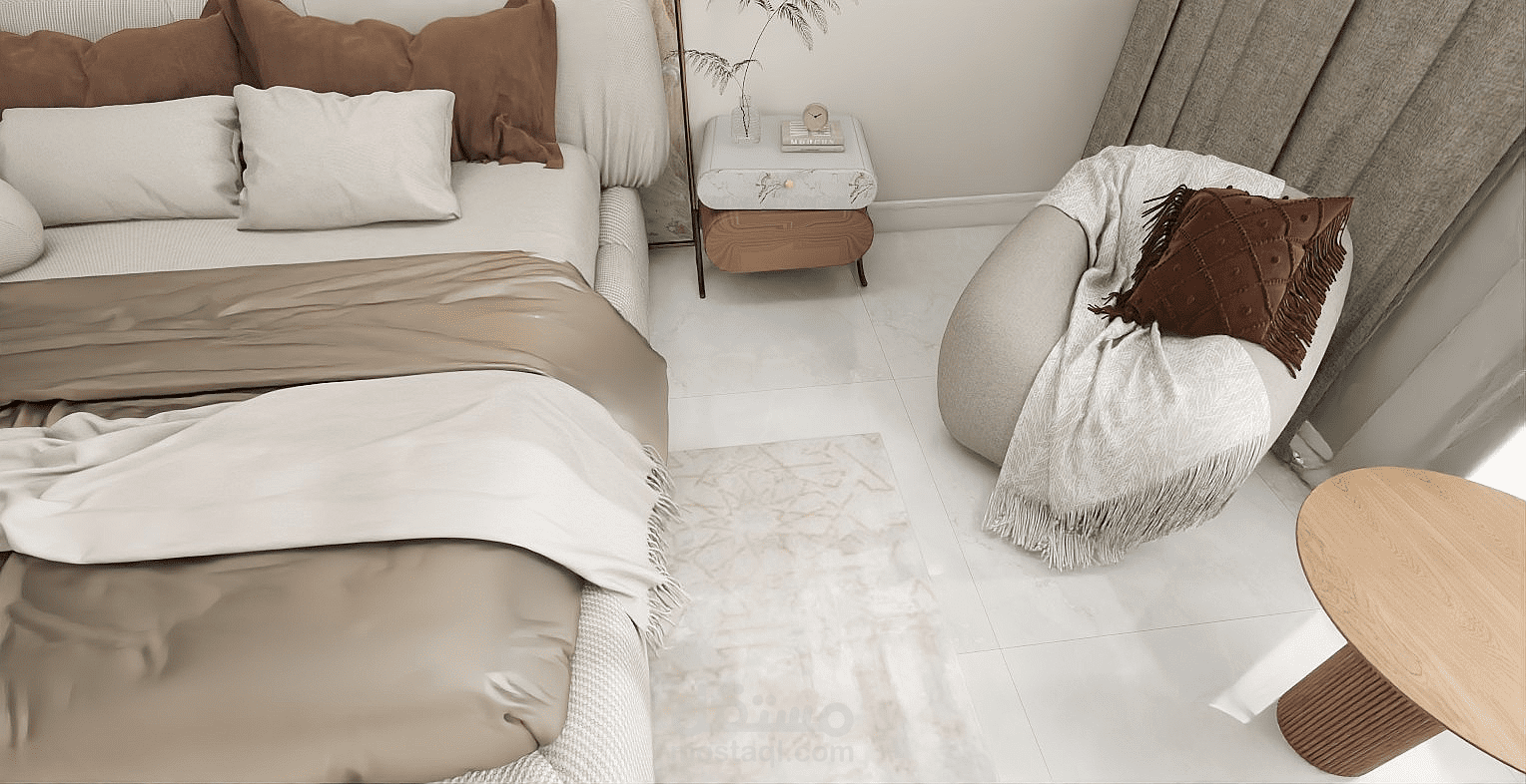 A cozy and modern bedroom featuring a comfortable bed with soft bedding and pillows. The room includes a wardrobe for storage and a nightstand beside the bed. Neutral wall colors create a calm atmosphere, and a window allows natural light to brighten the space. The lighting is warm, making the room relaxing and suitable for rest