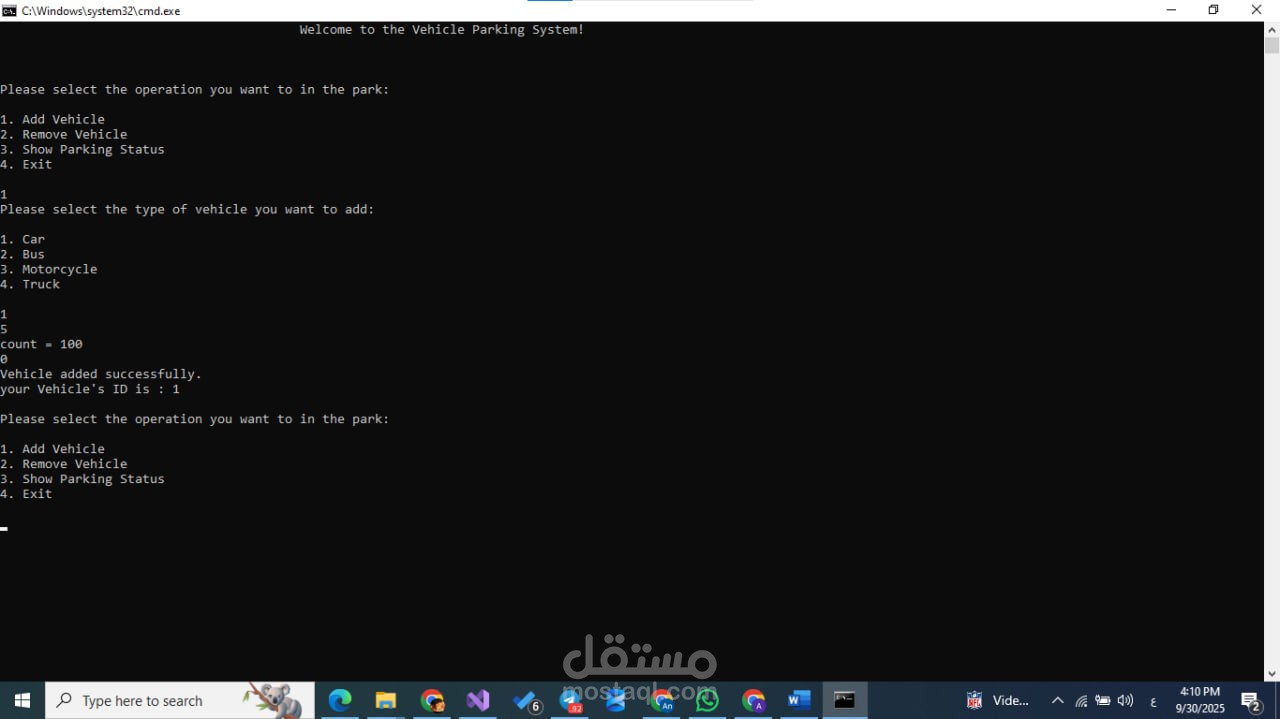 Developed a simple console-based application in C# using Object-Oriented Programming (OOP) principles. The system manages parking operations including vehicle registration, slot allocation, ticket generation, and fee calculation. The project demonstrates key OOP concepts such as Classes, Inheritance, Encapsulation, and Polymorphism.