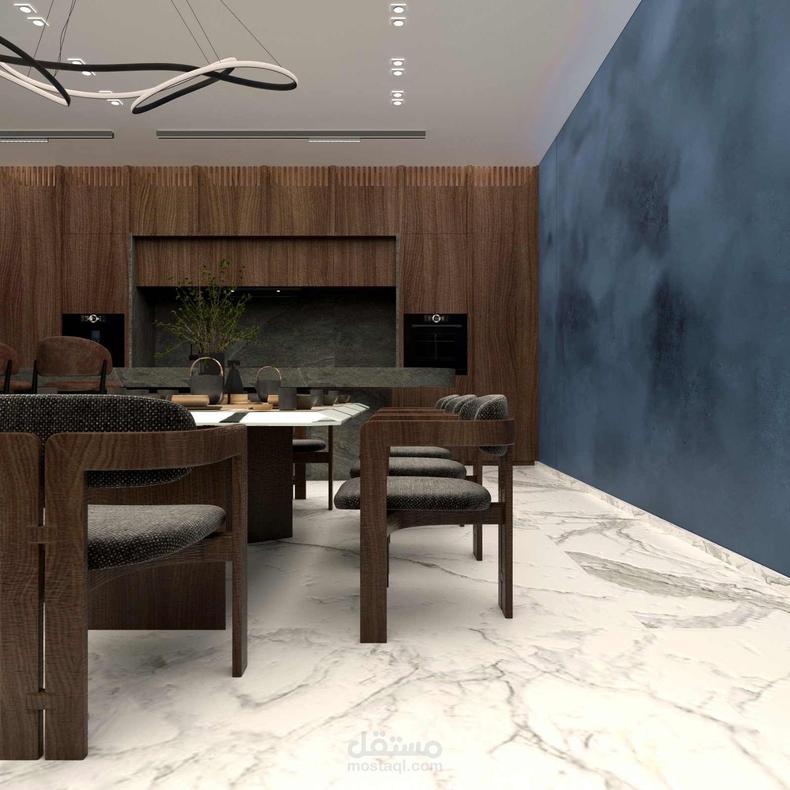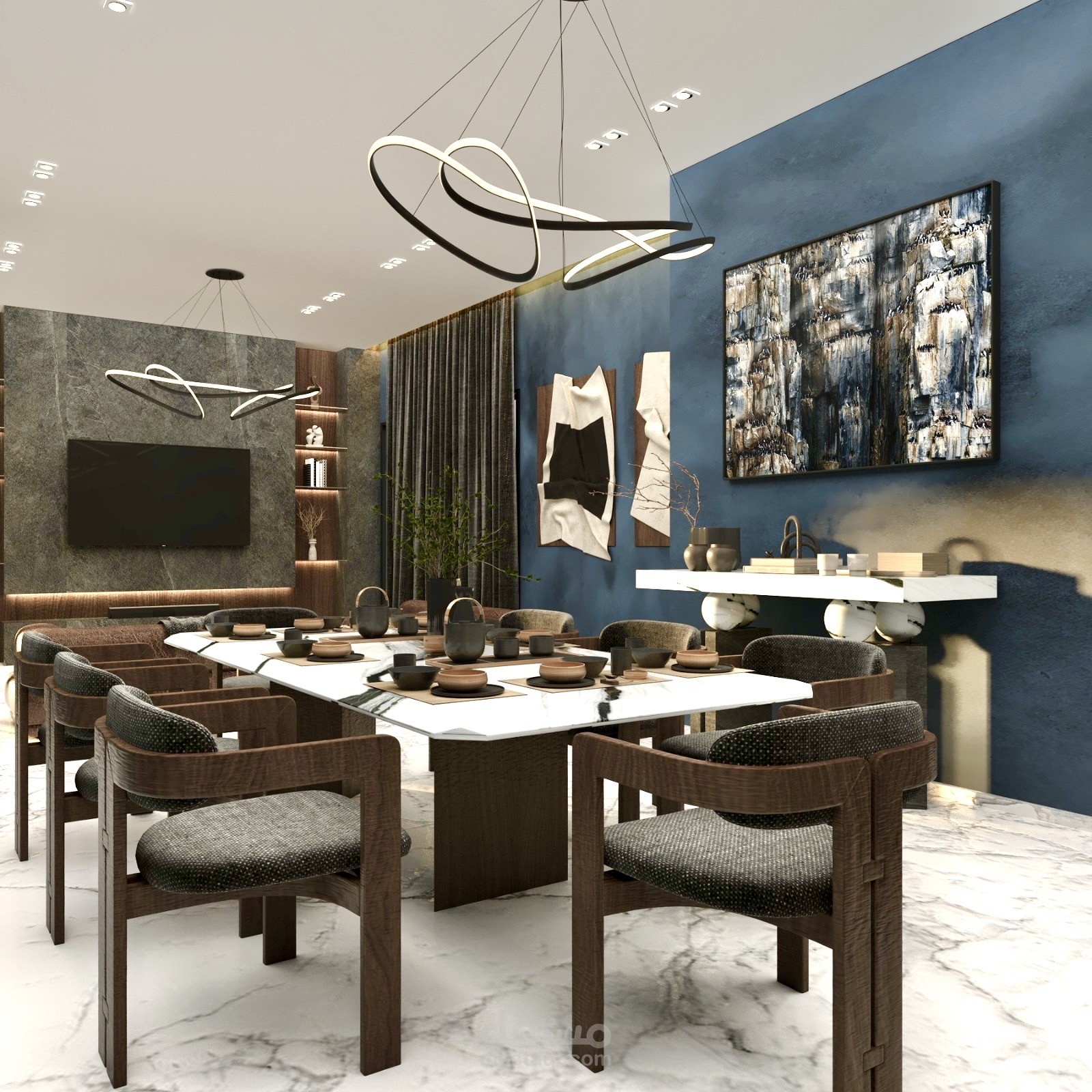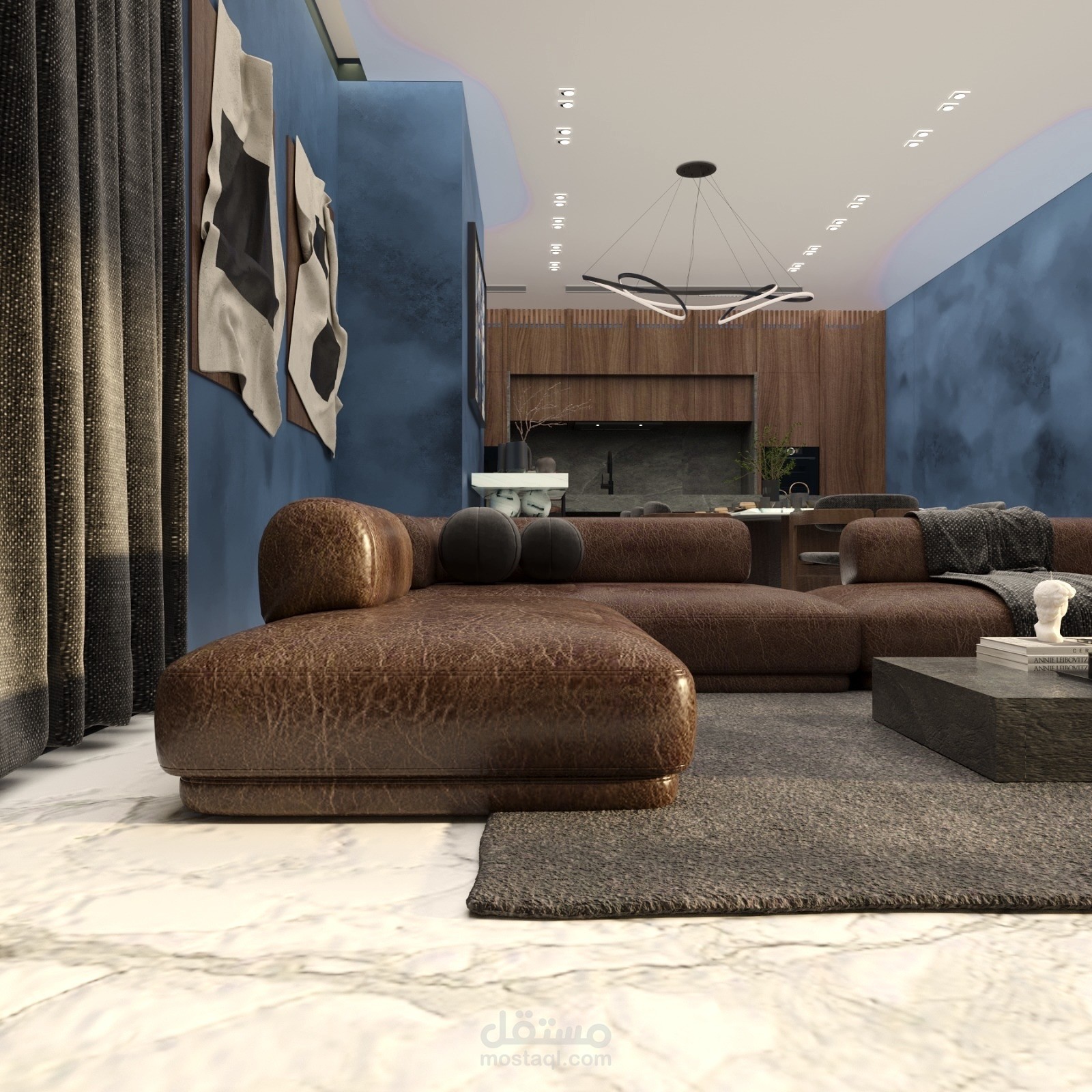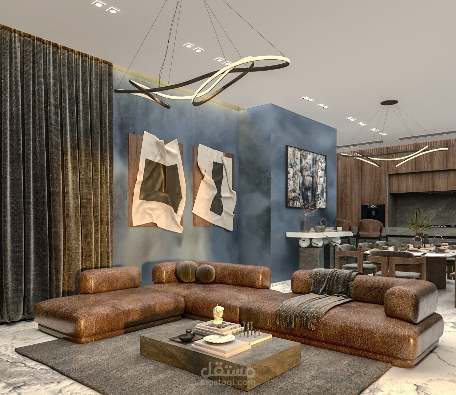 A contemporary living room design that blends comfort with sophistication. The large, low-profile leather sofa creates a sense of warmth and spaciousness, while the central wooden coffee table adds both practicality and elegance. Earthy tones harmonize beautifully with the striking blue accent wall and modern artwork, creating a visually balanced environment. The sculptural pendant lighting enhances the modern identity of the open space, seamlessly connecting the living area with the dining and