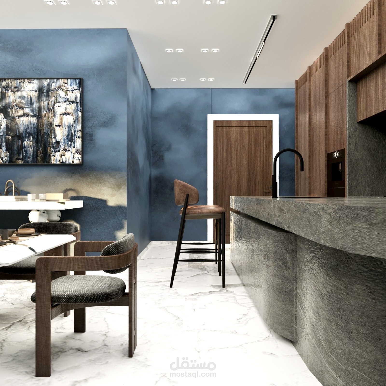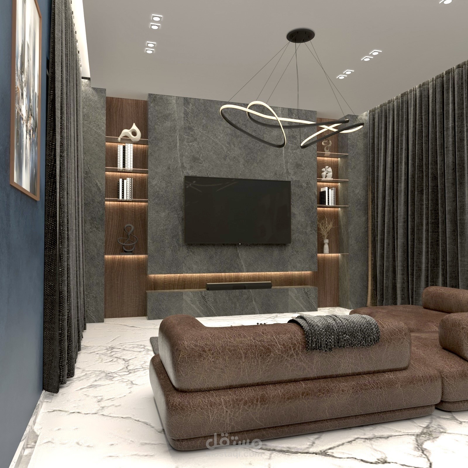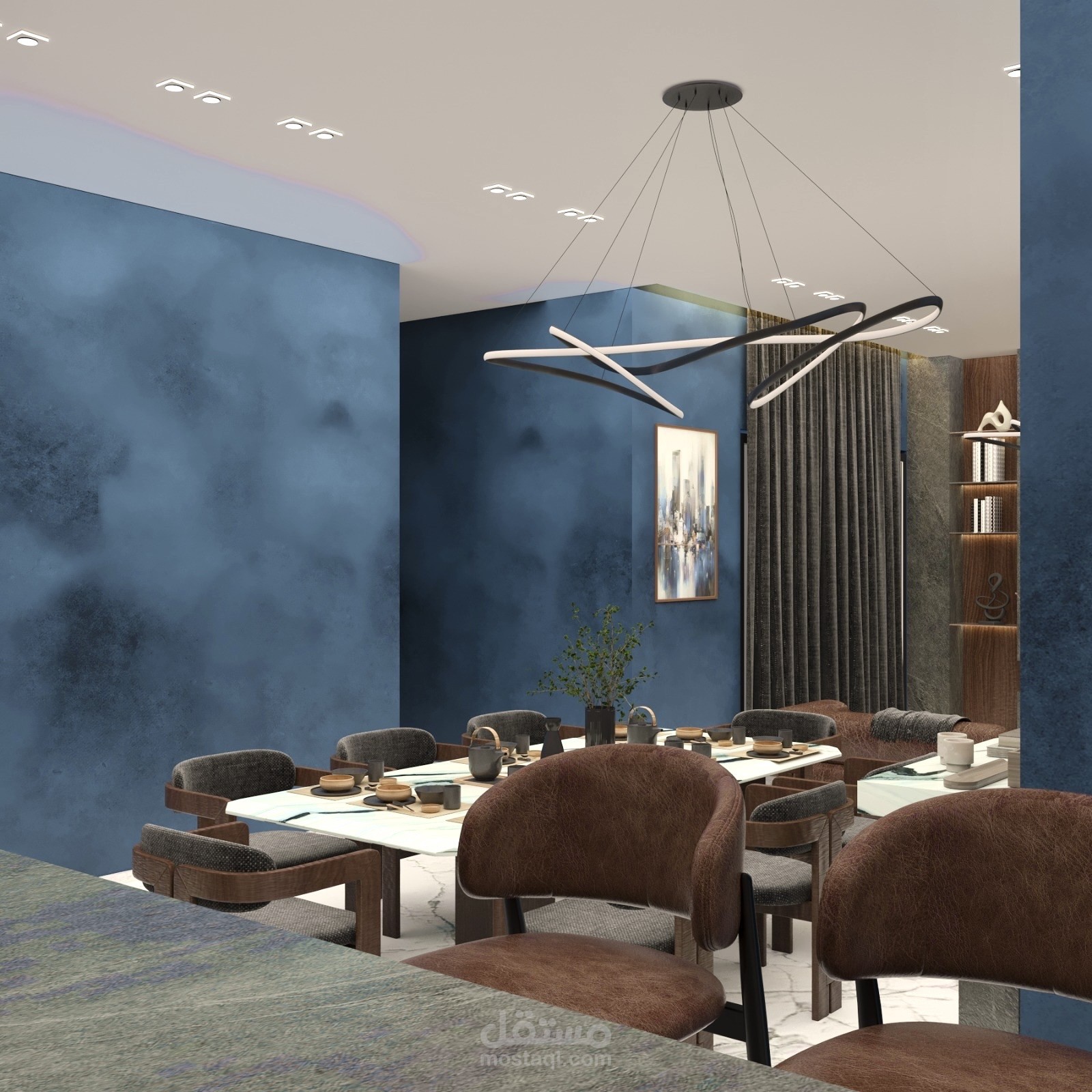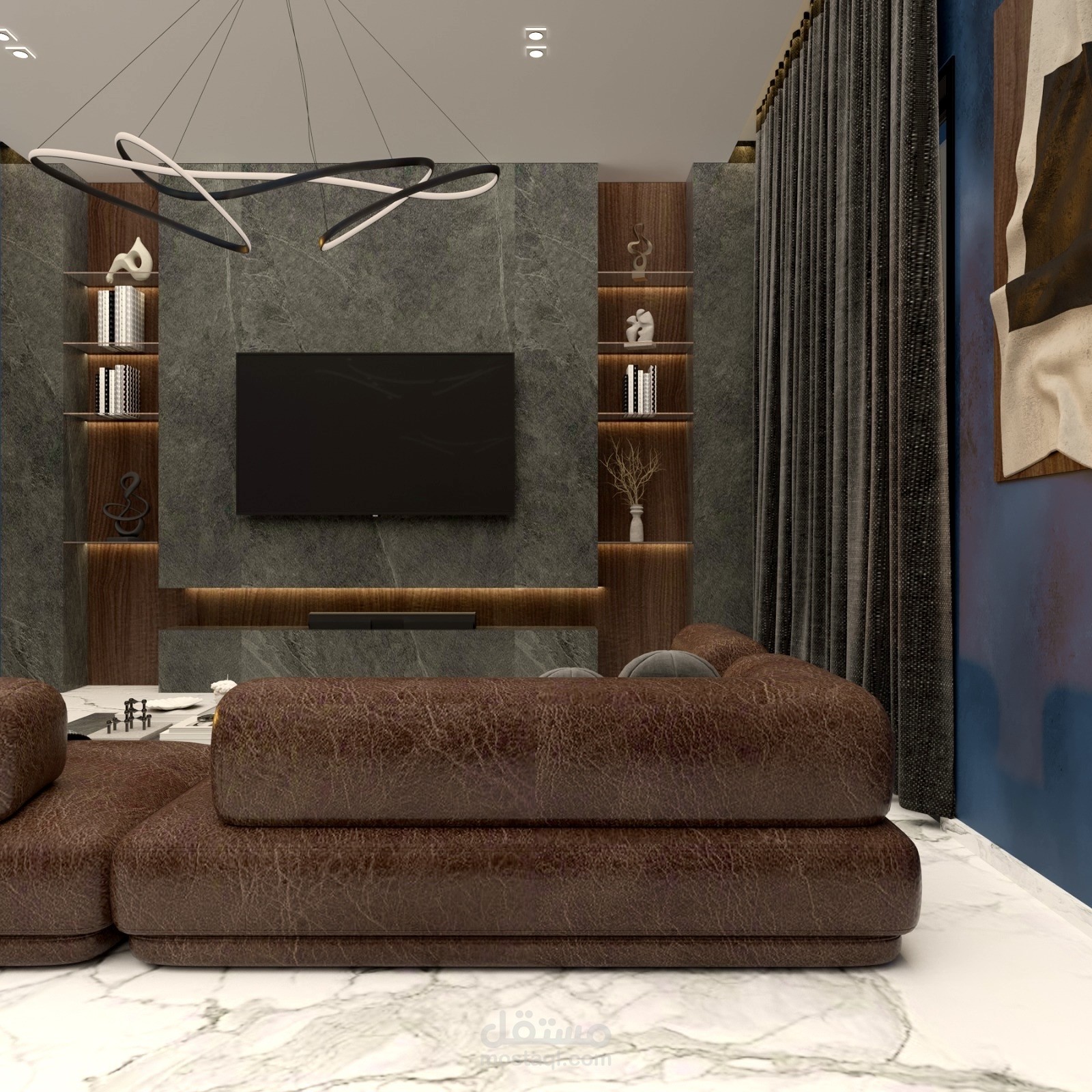 A contemporary living room design that blends comfort with sophistication. The large, low-profile leather sofa creates a sense of warmth and spaciousness, while the central wooden coffee table adds both practicality and elegance. Earthy tones harmonize beautifully with the striking blue accent wall and modern artwork, creating a visually balanced environment. The sculptural pendant lighting enhances the modern identity of the open space, seamlessly connecting the living area with the dining and