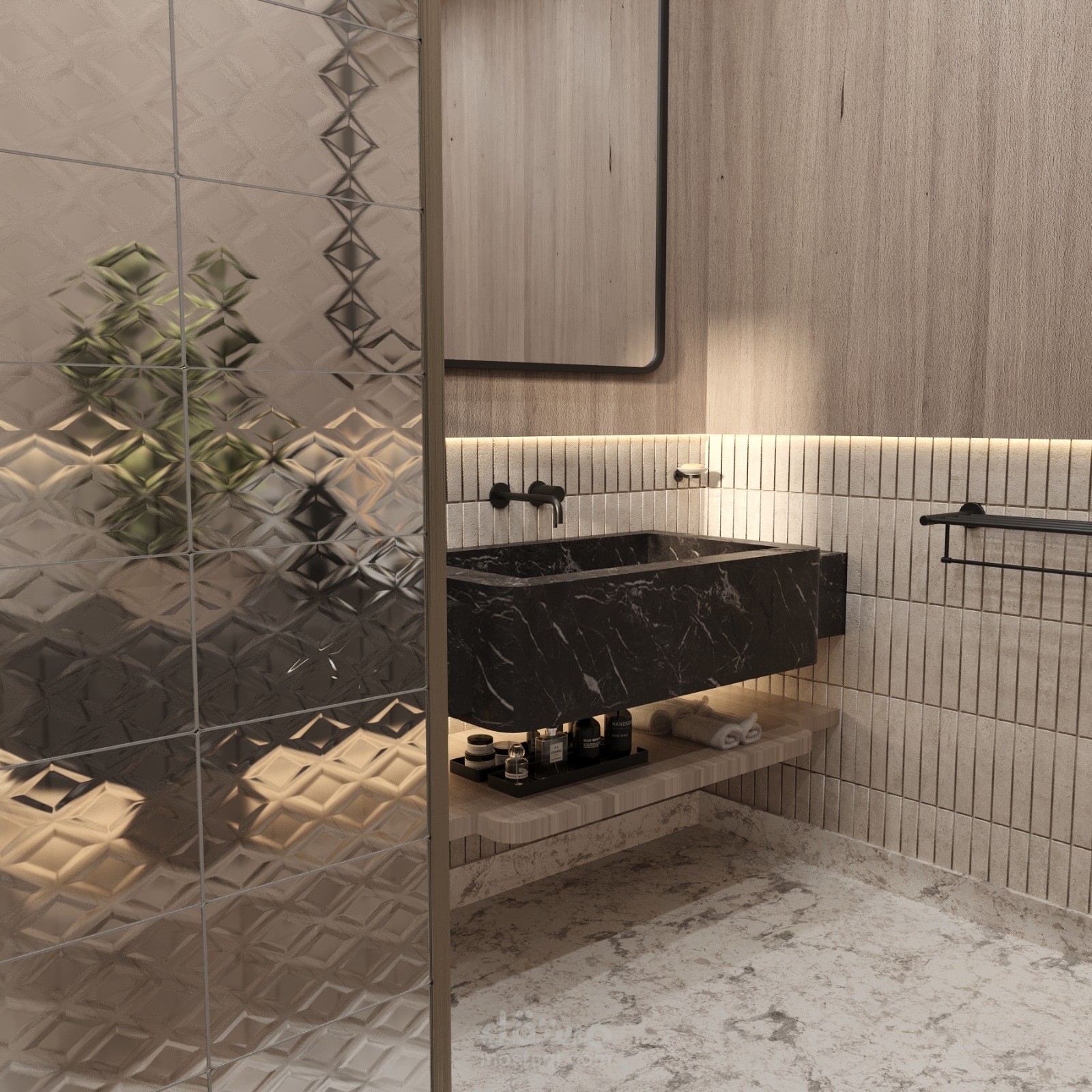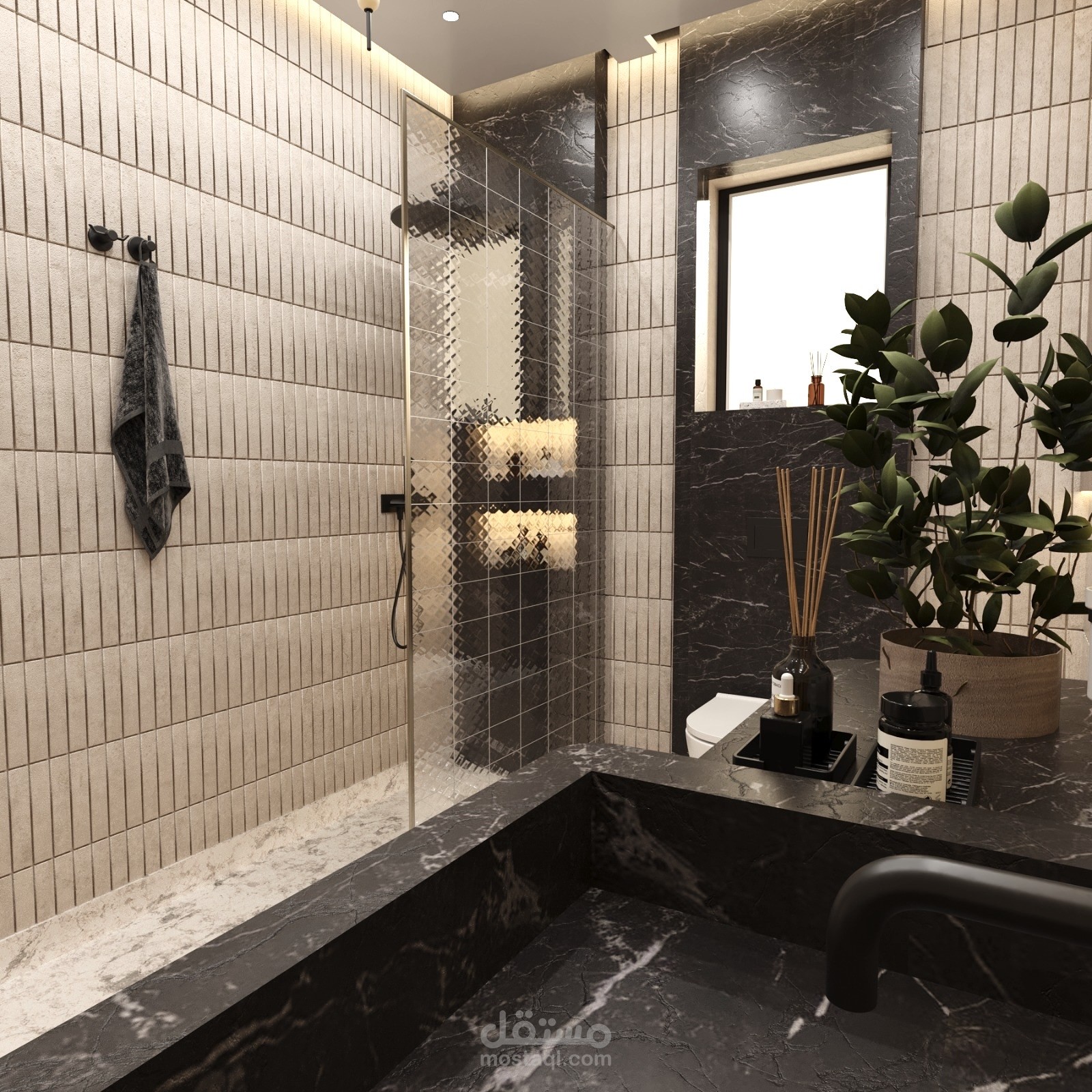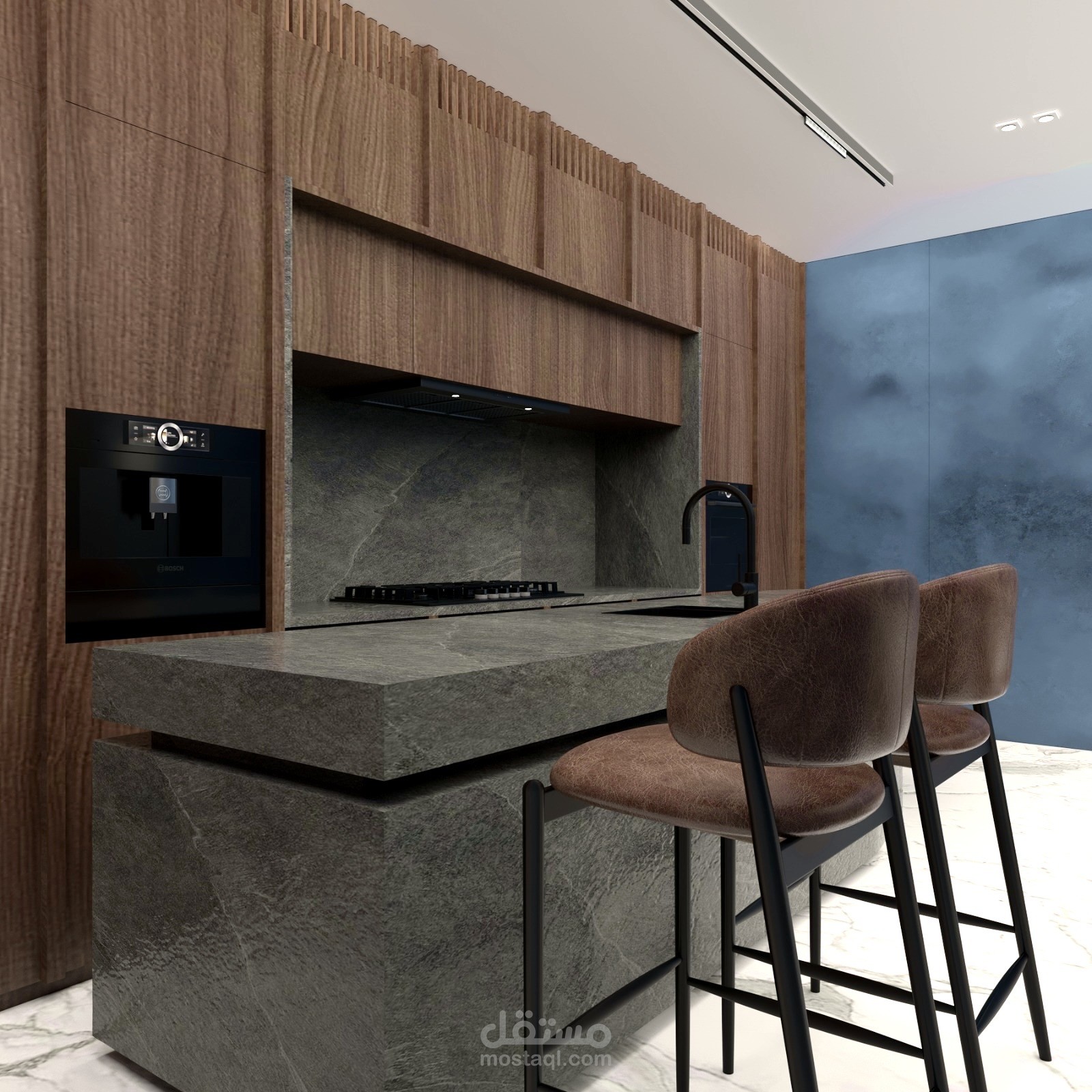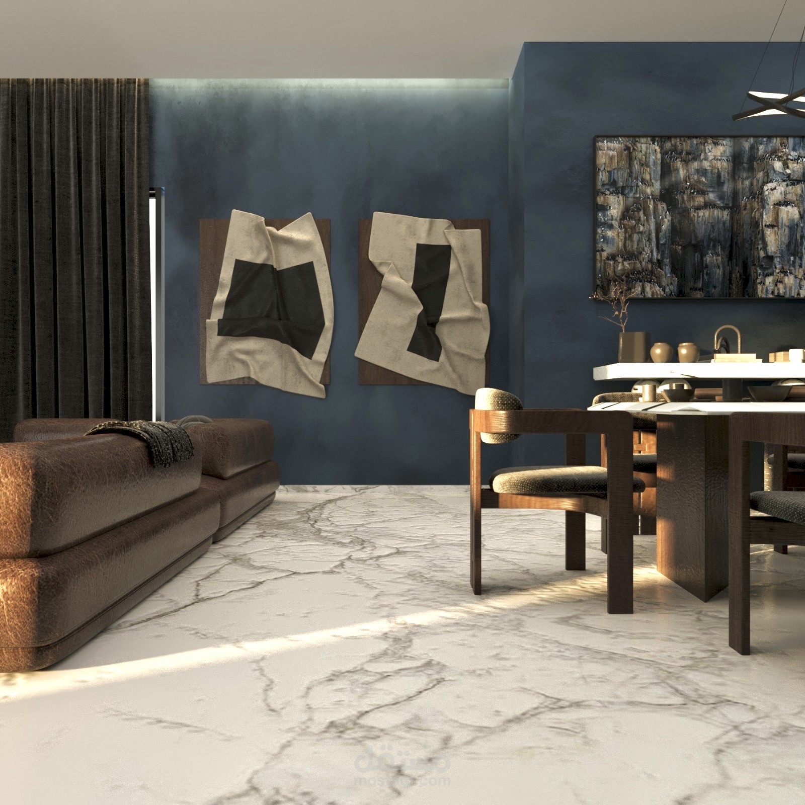 A contemporary living room design that blends comfort with sophistication. The large, low-profile leather sofa creates a sense of warmth and spaciousness, while the central wooden coffee table adds both practicality and elegance. Earthy tones harmonize beautifully with the striking blue accent wall and modern artwork, creating a visually balanced environment. The sculptural pendant lighting enhances the modern identity of the open space, seamlessly connecting the living area with the dining and