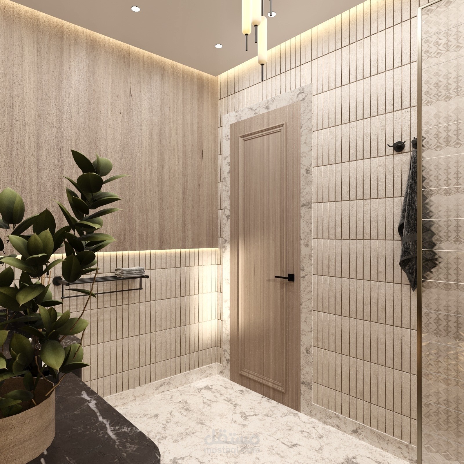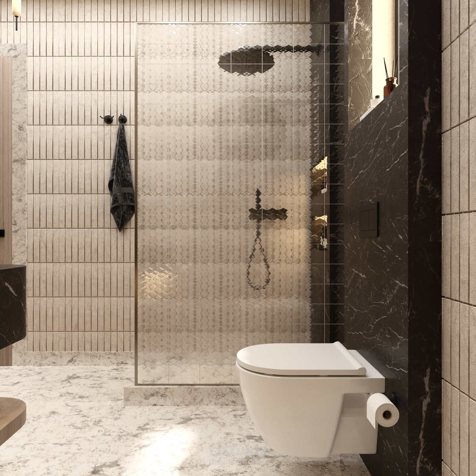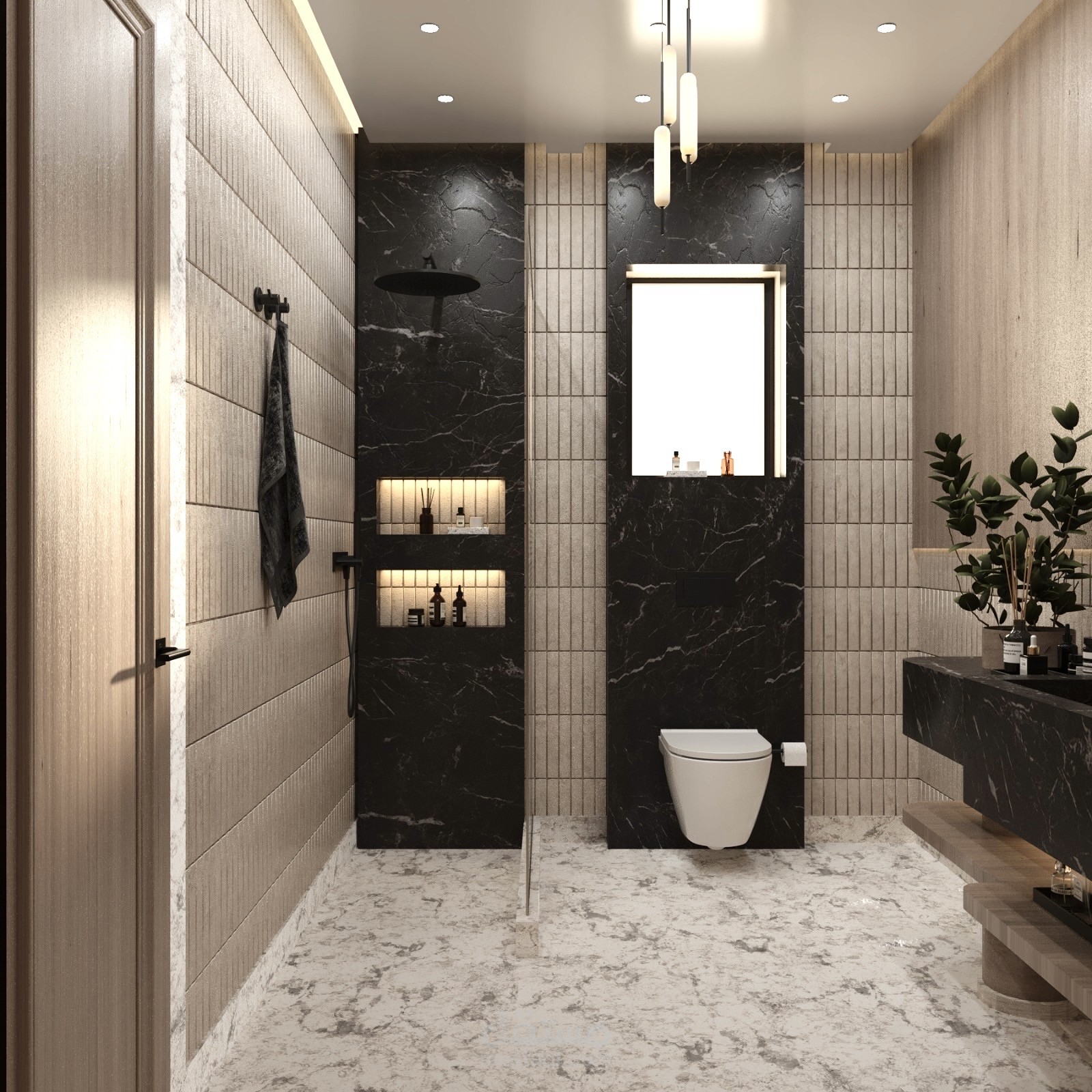 A modern bathroom design that combines luxury and warmth through the use of natural materials and ambient lighting. The black marble vanity stands out as a bold focal point, adding elegance and sophistication, while the wooden finishes and concealed lighting create a calm and inviting atmosphere. The balance between clean vertical lines and minimal detailing reflects a contemporary design identity that emphasizes both functionality and refined aesthetics.