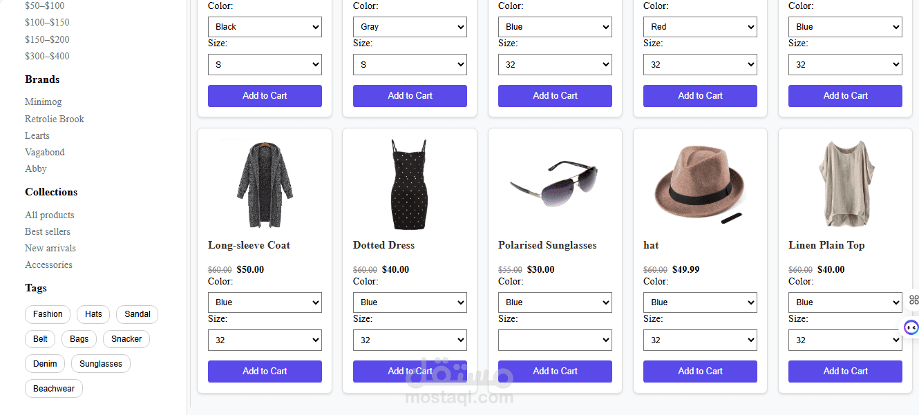 This project is a frontend e-commerce web application built with React. It provides users with a seamless shopping experience, including browsing products, filtering by categories, viewing detailed product pages, adding items to the cart, and completing checkout. The application uses a component-based structure with global state management for the shopping cart to ensure consistent updates across pages. The design focuses on usability, clean UI, and responsive layout to enhance the user experience.