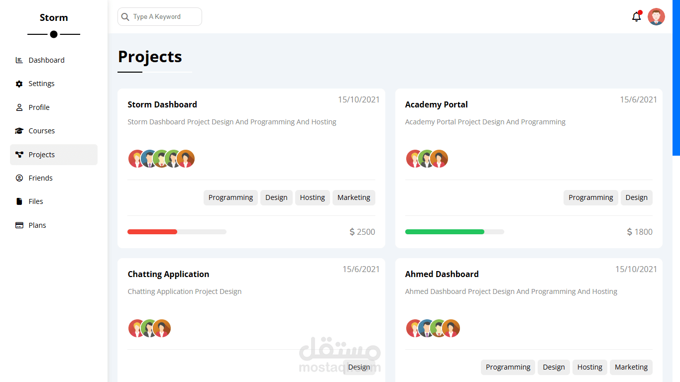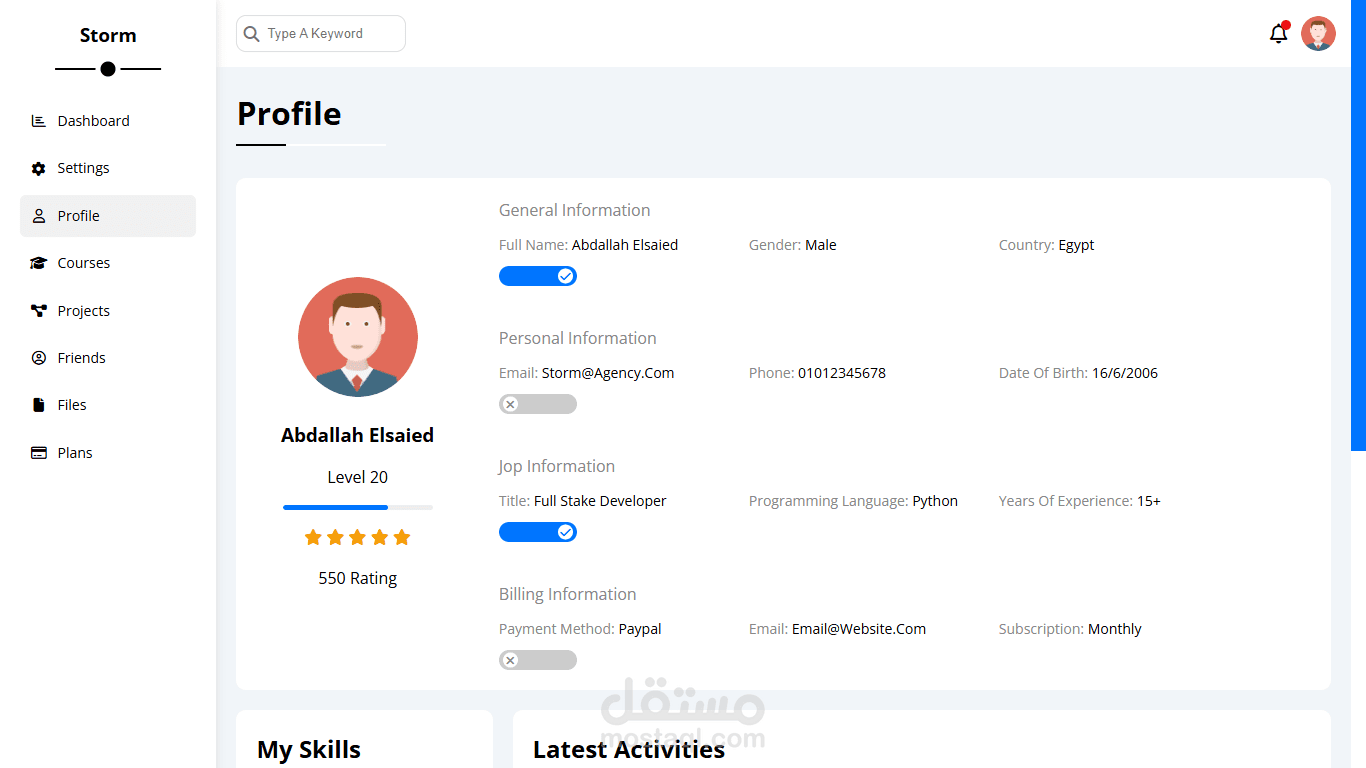 في هذا المشروع، قمت بتصميم وإنشاء لوحة تحكم تفاعلية لموقع أو تطبيق، تتضمّن مكونات واجهة المستخدم الأساسية مثل الشريط الجانبي، البطاقات الإحصائية، الرسوم البيانية، القوائم، وغيرها من العناصر التي تُعرَض البيانات بطريقة منظمة وجذّابة.