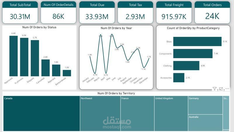 لوحة معلومات احترافية تم تطويرها باستخدام أداة Microsoft Power BI بهدف تقديم رؤية 360 درجة عن أداء المبيعات ودورة حياة الطلبات. تمكن هذه الأداة الإدارة من متابعة وتحليل الجوانب التالية: