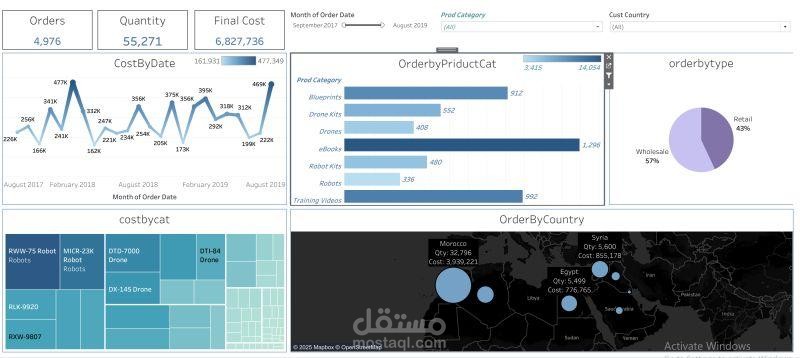 المؤشرات والأداء العام: عرض لأهم المقاييس مثل إجمالي الطلبات (4,976)، والكمية الإجمالية (55,271)، والتكلفة النهائية (6.8 مليون).