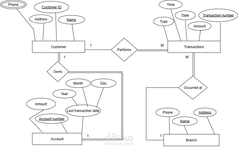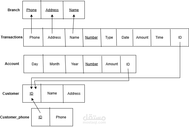 1- تصميم قاعدة بيانات بنكية من خلال ERD يوضح الكيانات الرئيسية مثل العملاء، الحسابات، الفروع، والمعاملات، مع إعداد Mapping للجداول والحقول والمفاتيح (Primary & Foreign Keys).