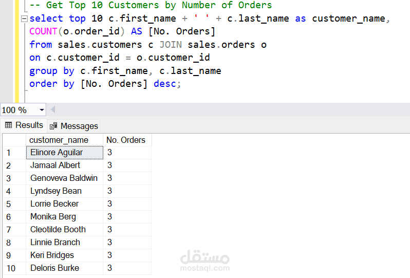 - تحليل العملاء : عرض أعلى 10 عملاء من حيث عدد الطلبات.