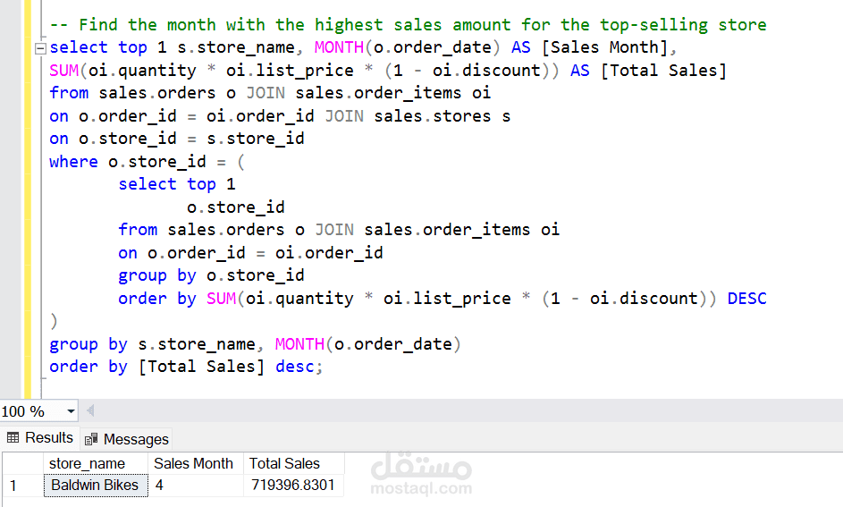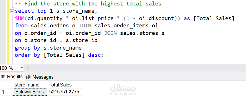 - تحليل أداء المتاجر : تحديد المتجر الأعلى في إجمالي المبيعات.