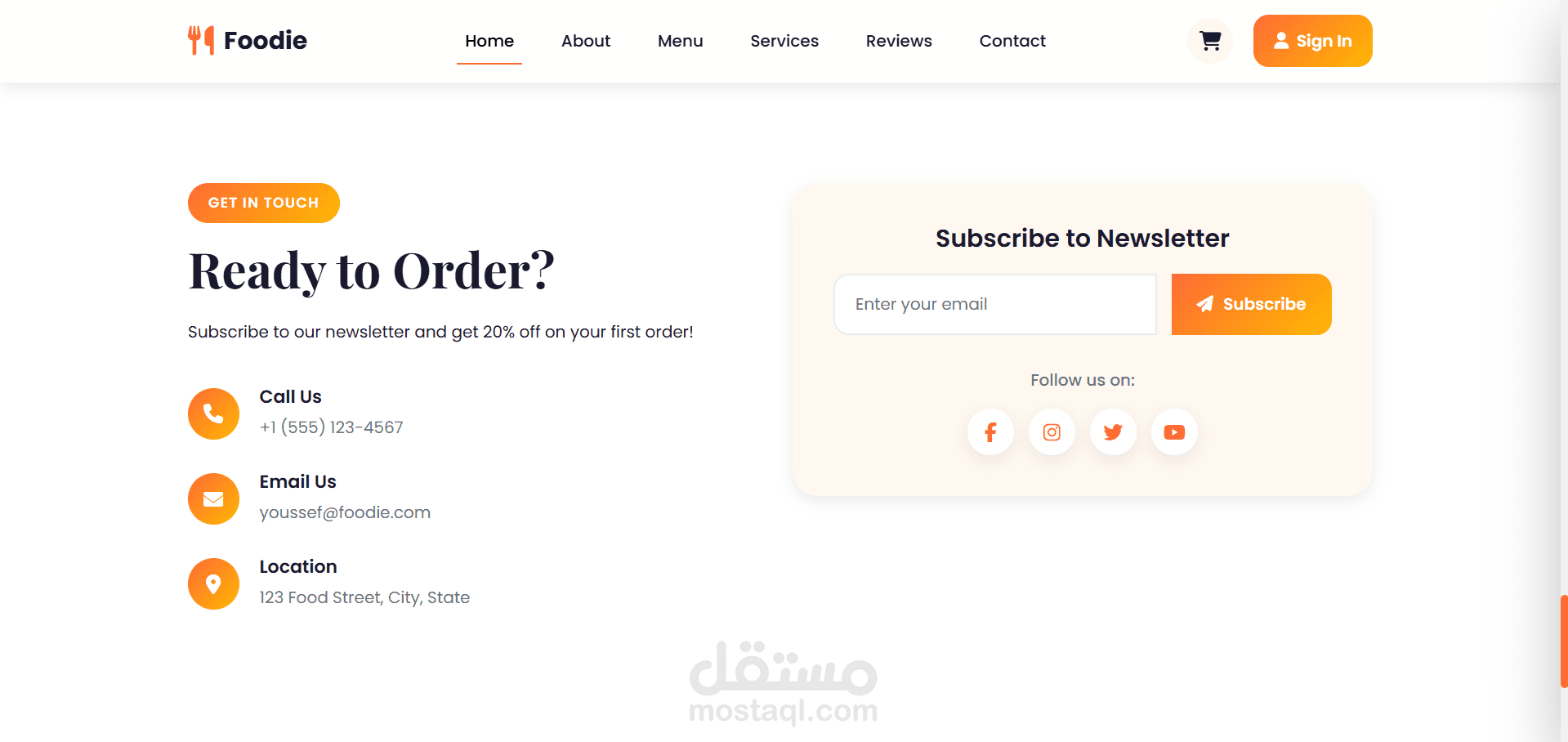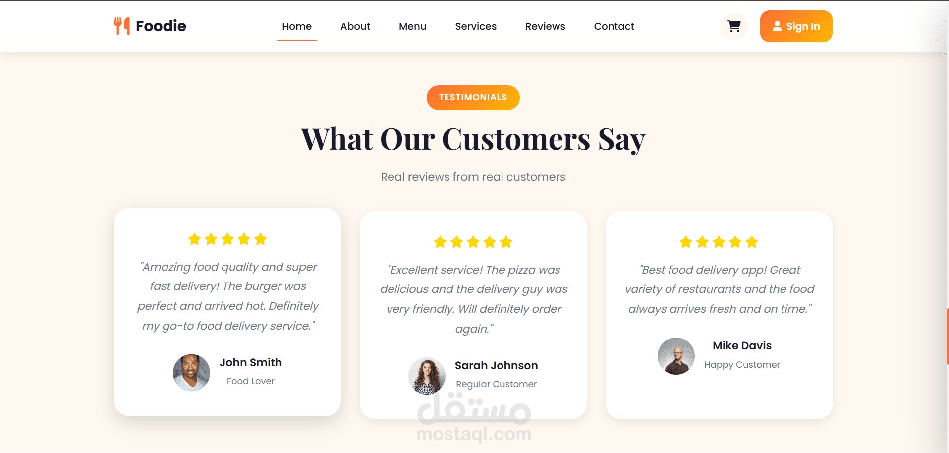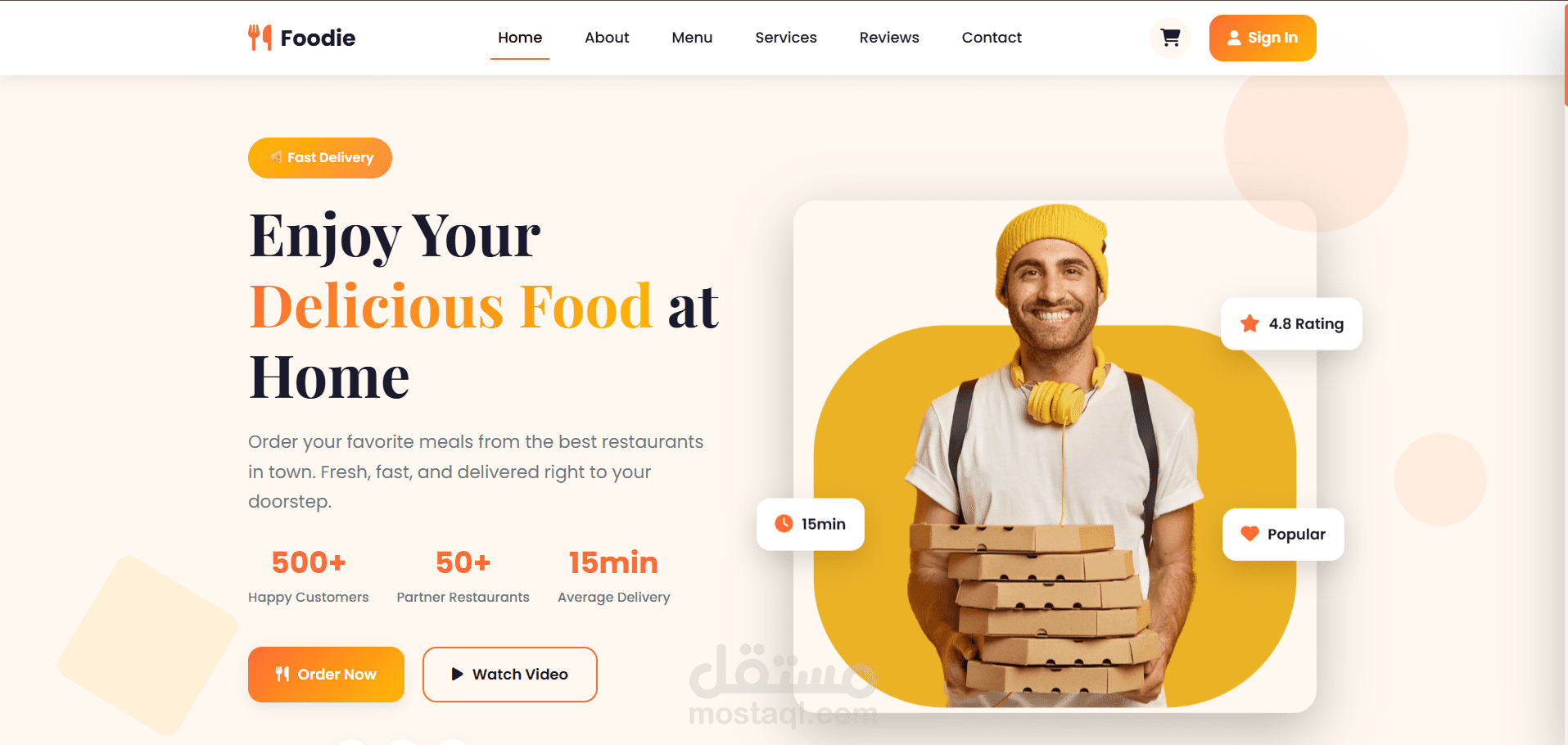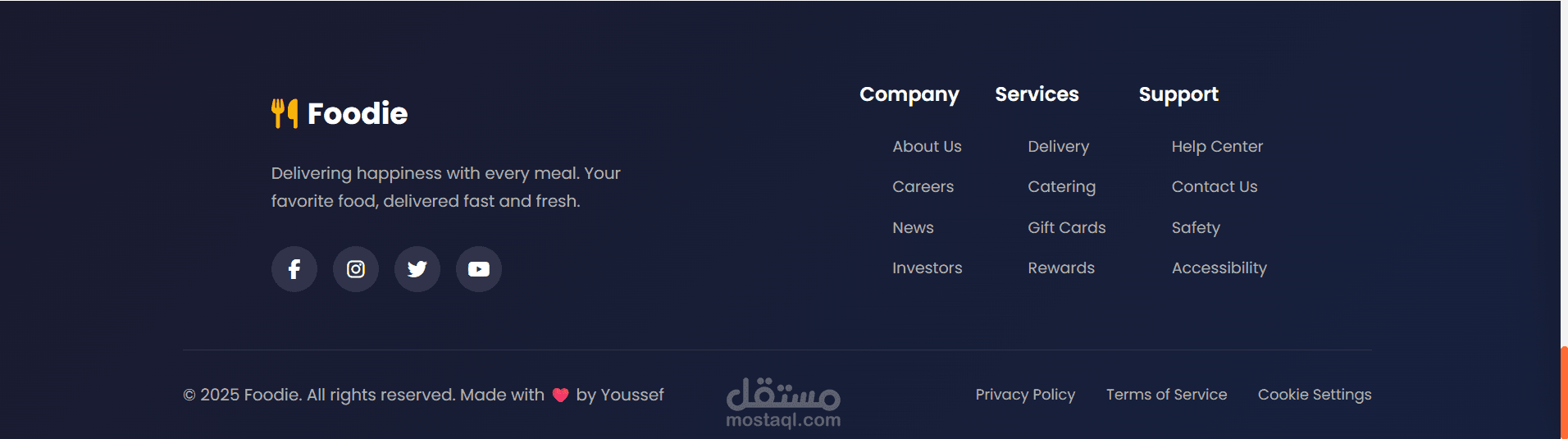 فودي - منصّة متكاملة لتوصيل الطعام السريع ?. نوفّر لك تجربة سهلة وممتعة لاختيار وجبتك المفضلة من أفضل المطاعم المحلية والعالمية، مع واجهة عصرية مصممة باستخدام CSS و Bootstrap لضمان سرعة التصفح وسهولة الاستخدام. استمتع بطلب طعامك أونلاين في ثوانٍ، مع خدمة توصيل آمنة وسريعة حتى باب بيتك. هدفنا تقديم جودة عالية، تنوع في الأطباق، وأسعار تناسب الجميع لتعيش تجربة طعام لا تُنسى.