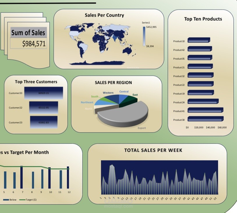 تم تصميم لوحة بيانات (Dashboard) تحليلية متكاملة لتوفير رؤية شاملة وعميقة حول أداء وتوزيع المبيعات. تم بناء هذه اللوحة لمساعدة مديري المبيعات وصناع القرار على فهم مصادر الإيرادات بشكل دقيق، وتحديد أهم المنتجات والعملاء، ومراقبة الأداء مقارنة بالأهداف المحددة.