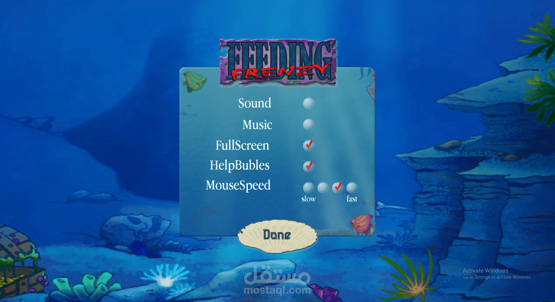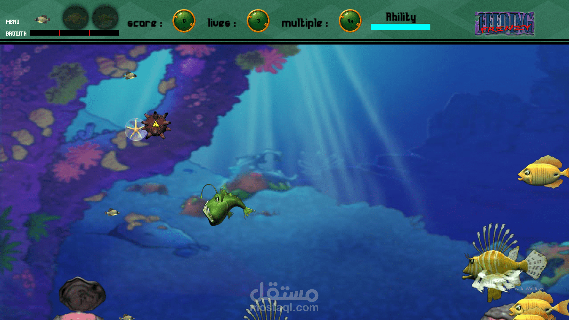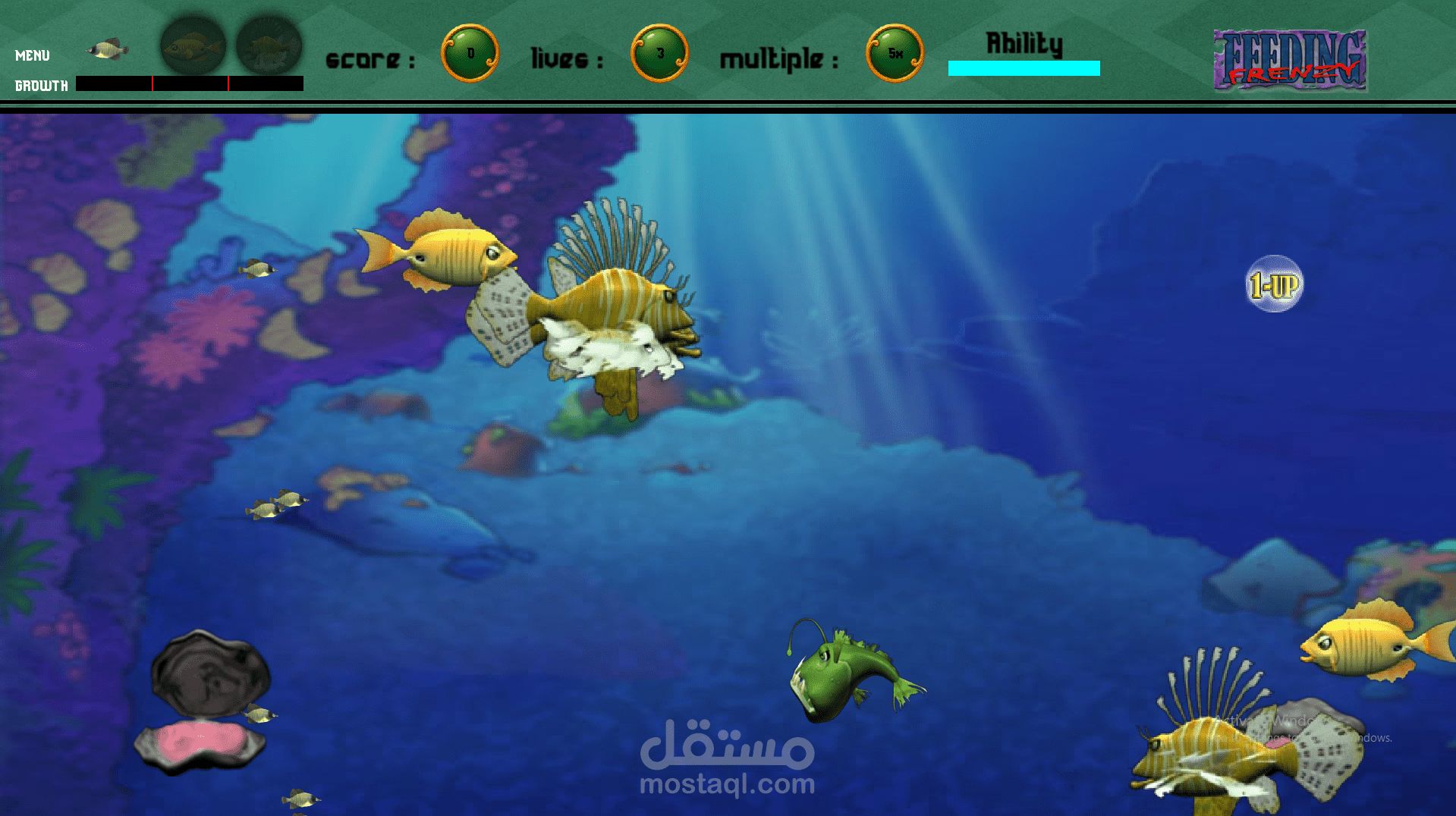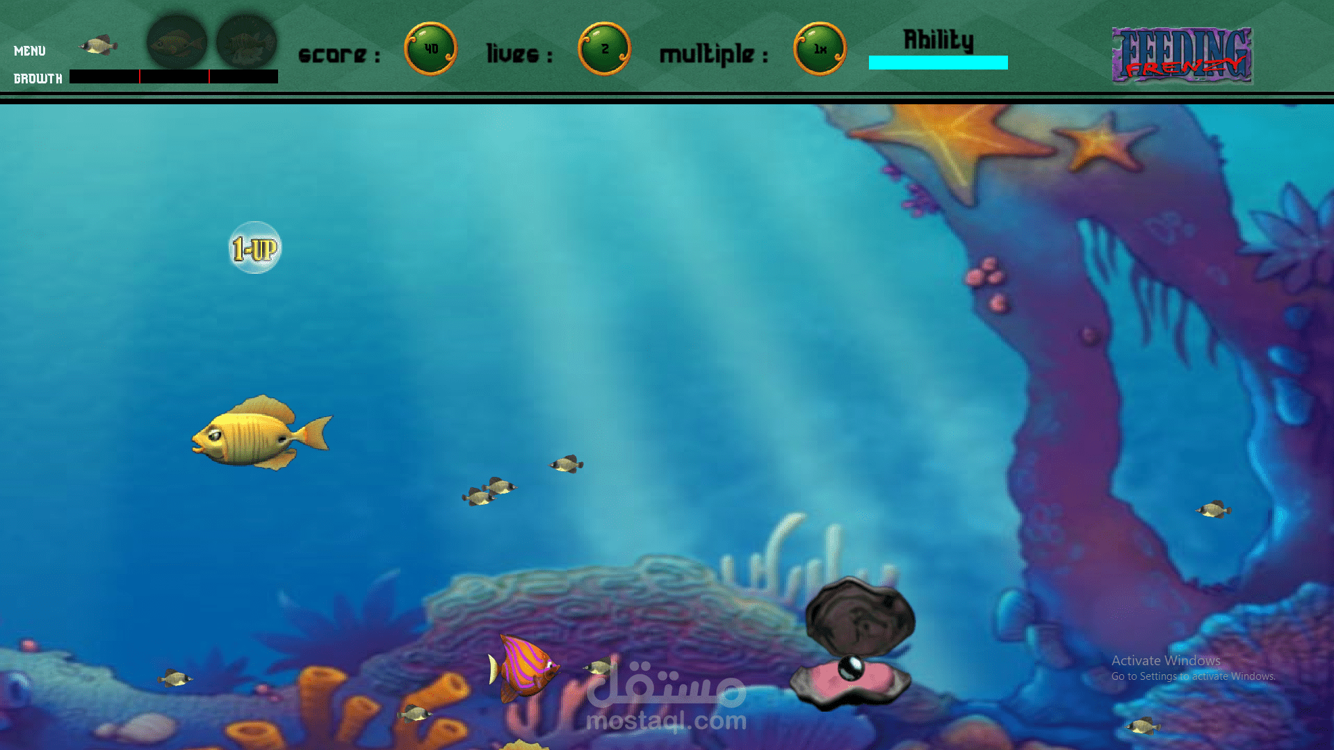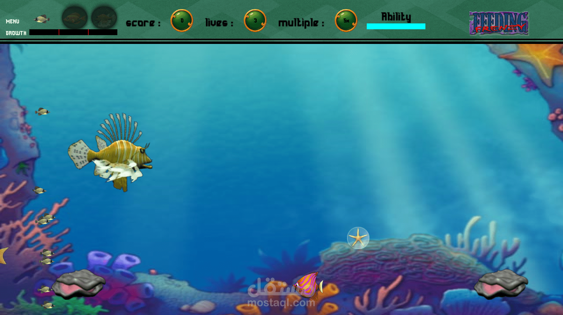 لعبة 2D Arcade مستوحاة من Feeding Frenzy، تم تطويرها كجزء من مشروع جامعي باستخدام C++ و SFML. الفكرة الأساسية إنك تتحكم في سمكة صغيرة بتاكل الأسماك الأصغر عشان تكبر وتجمع نقاط، وفي نفس الوقت لازم تتجنب الأسماك الأكبر والأعداء.