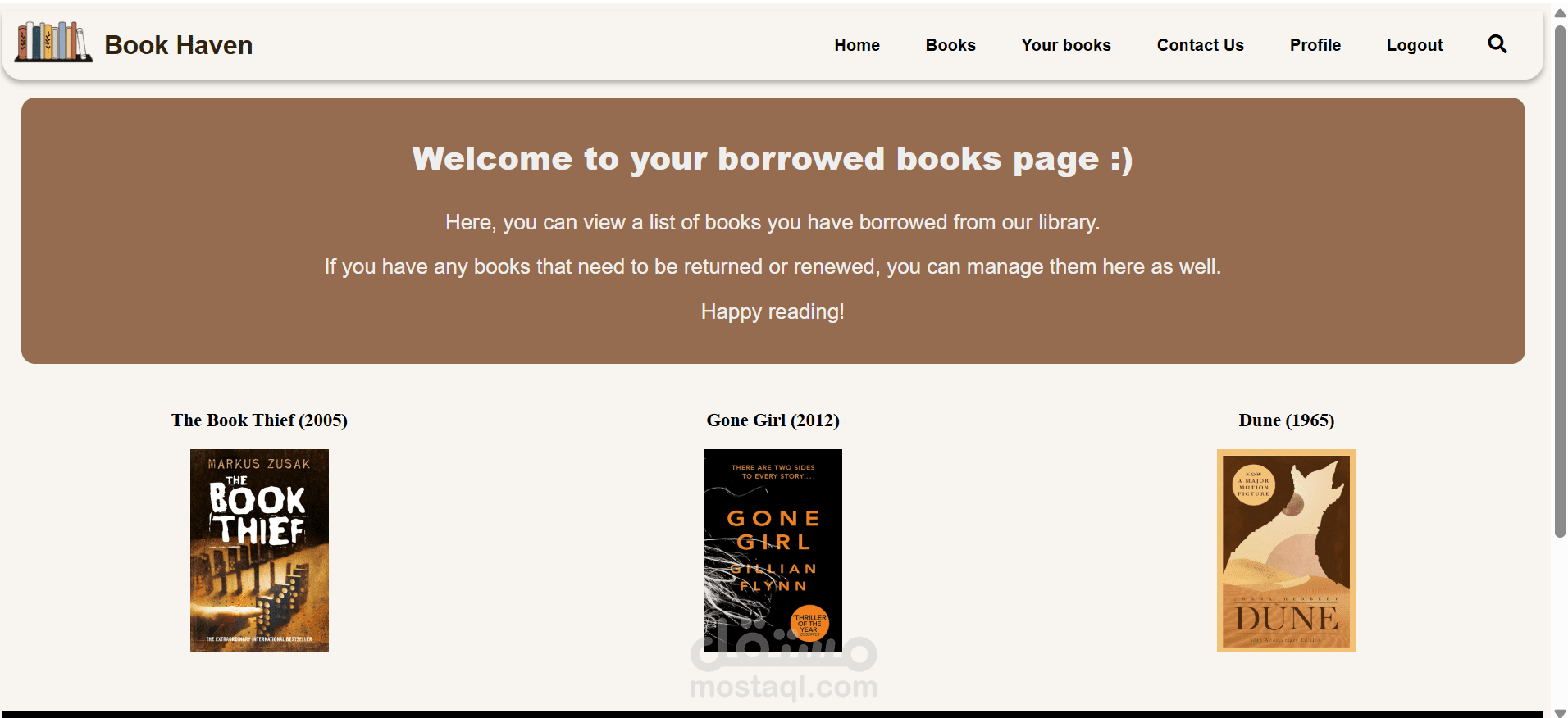 5- صفحة الكتب المستعارة (Borrowed Books): تعرض الكتب التي استعيرت مع تفاصيلها وتاريخ انتهاء الاستعارة.