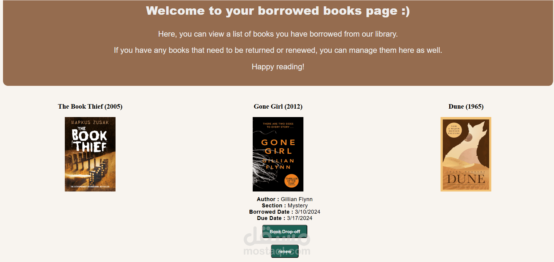 4- إجراء استعارة (Borrow): يمكن للمستخدم استعارة أي كتاب، ليتم إضافته تلقائيًا إلى صفحة "الكتب المستعارة".
