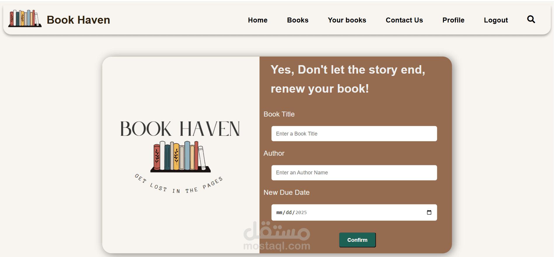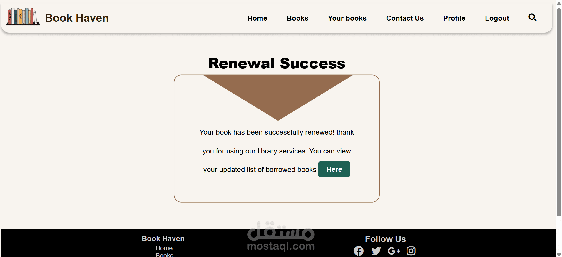 2- تجديد كتاب (Renew) بمدة جديدة يحددها المستخدم، مع انتقاله لصفحة تأكيد تخبره أن عملية التجديد تمت بنجاح.