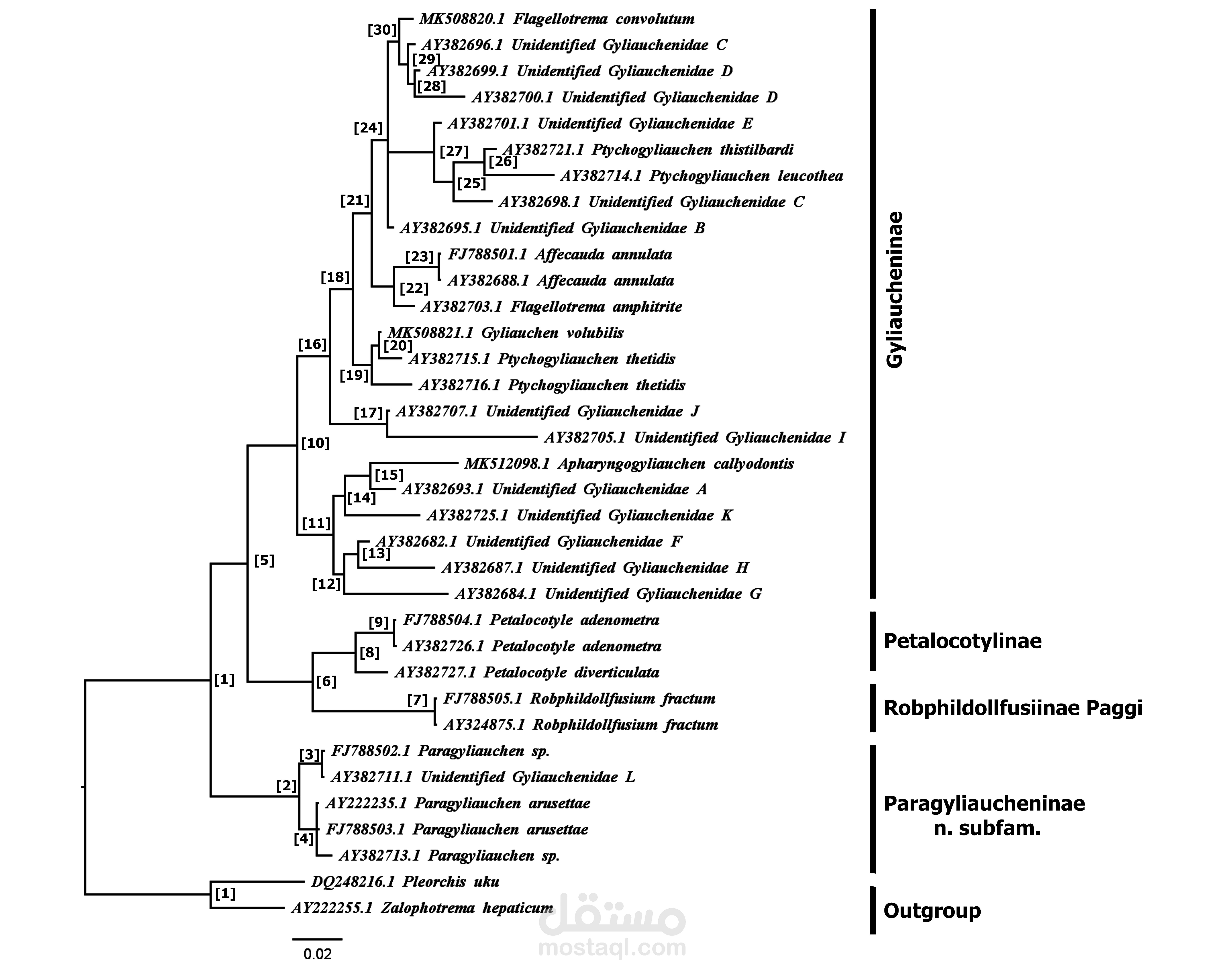 -إنشاء تحت فصيلة جديدة: تم إنشاء تحت فصيلة جديدة تُسمى .Paragyliaucheninae n. subfam. لاحتواء الجنس Paragyliauchen