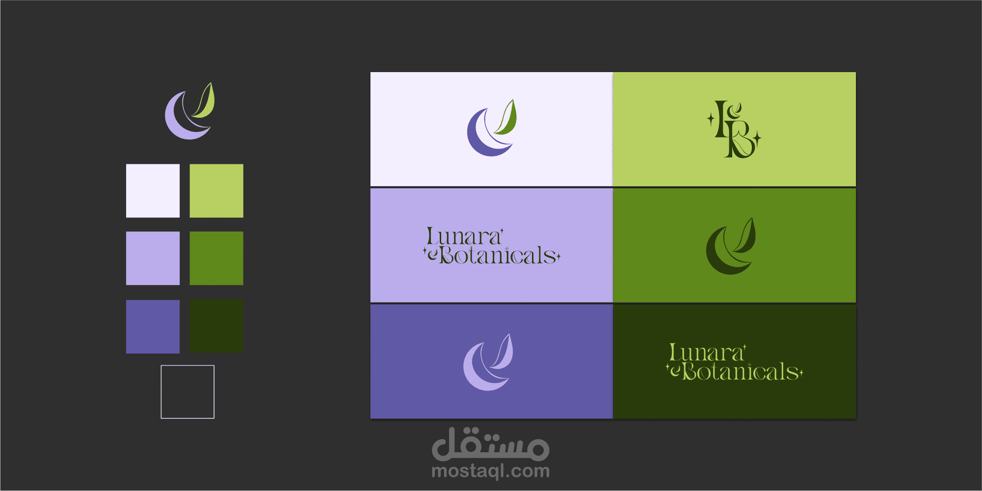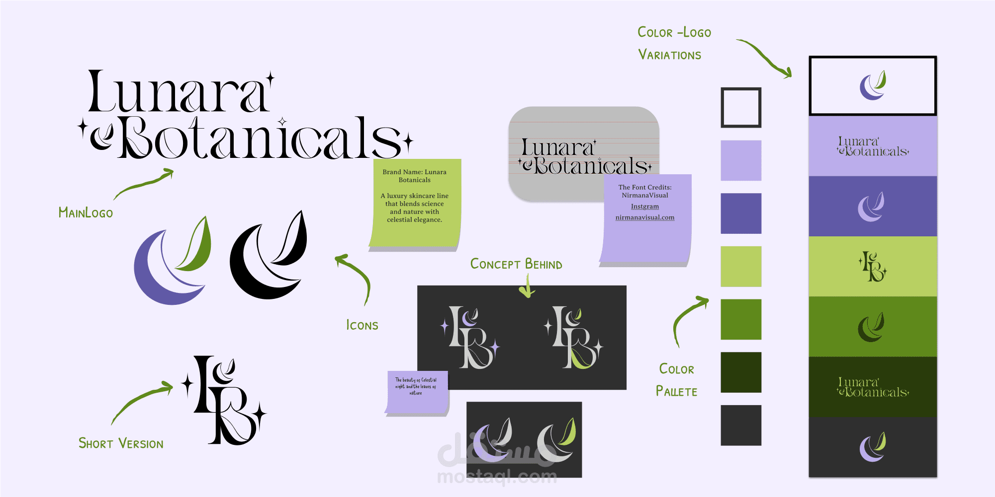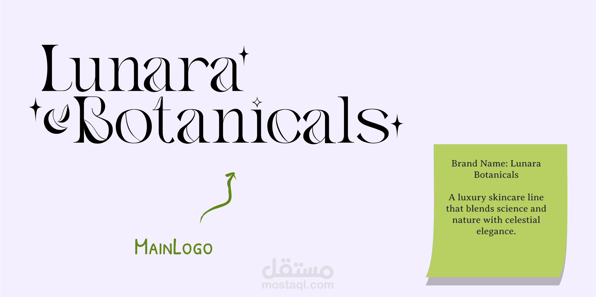 تصميم شعار باستخدام Figma لعلامة Lunara Botanicals، وهي علامة فاخرة للعناية بالبشرة تجمع بين العلم والطبيعة بأناقة سماوية.