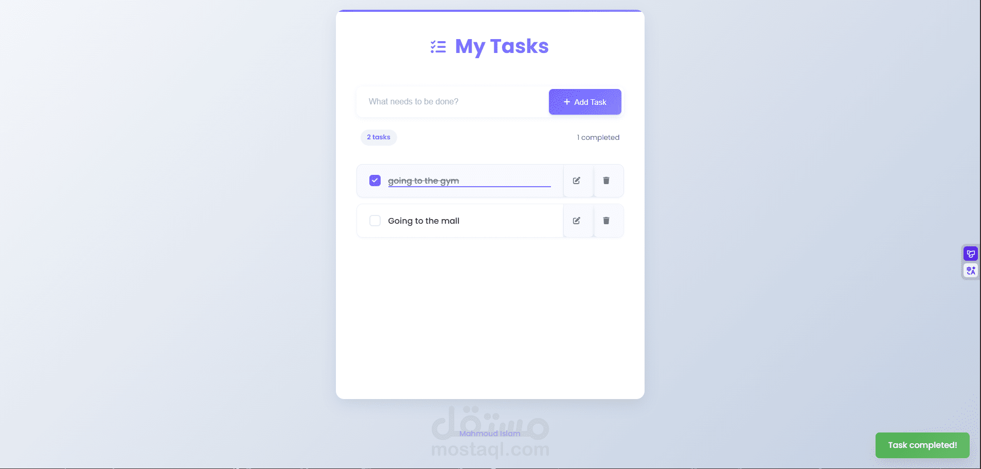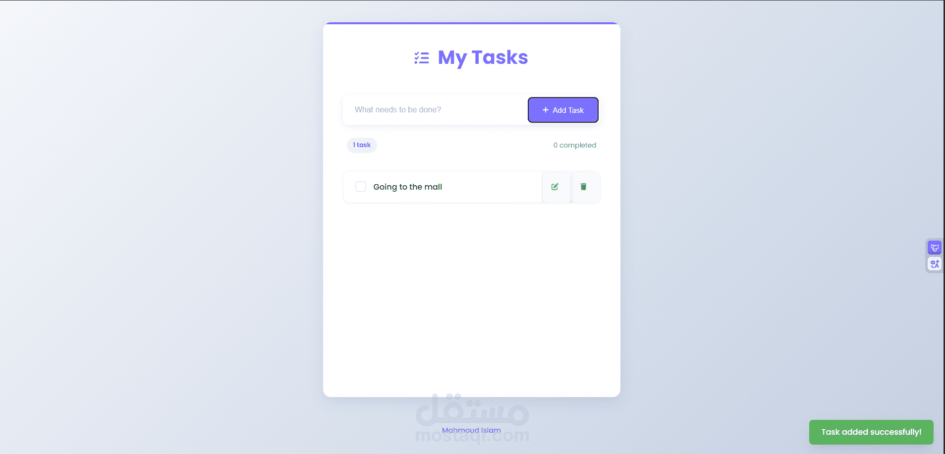 تطبيق ويب متكامل لإدارة المهام اليومية بطريقة أنيقة وسهلة الاستخدام. يتيح للمستخدمين إضافة مهام جديدة، تعديلها، حذفها، وتحديد حالة إنجازها.