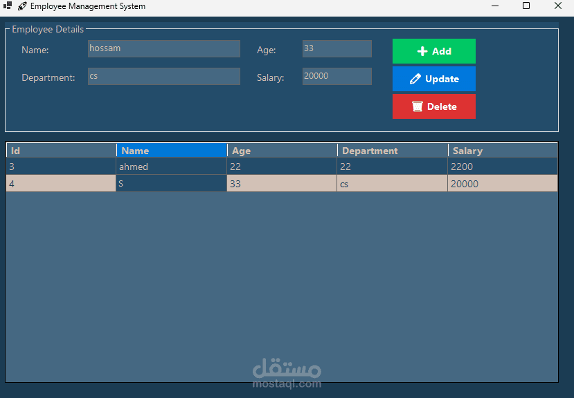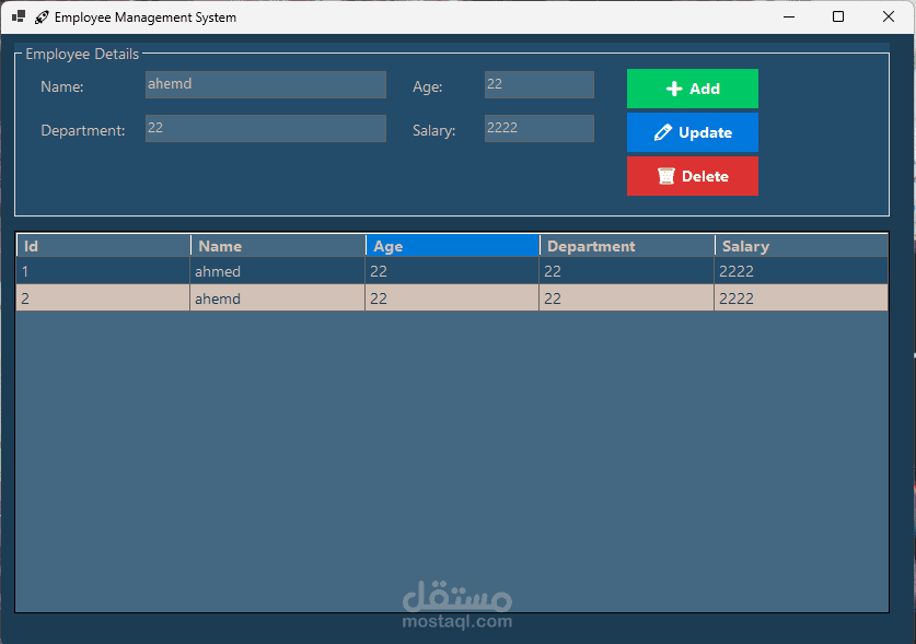 - إضافة موظفين جدد مع البيانات الأساسية (الاسم، العمر، القسم، الراتب).