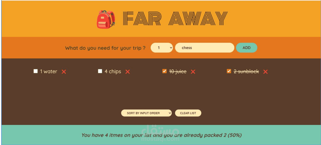 Far Away هو تطبيق بسيط وتفاعلي تم تطويره باستخدام React.js لمساعدتك في تجهيز وتتبع أغراض السفر.