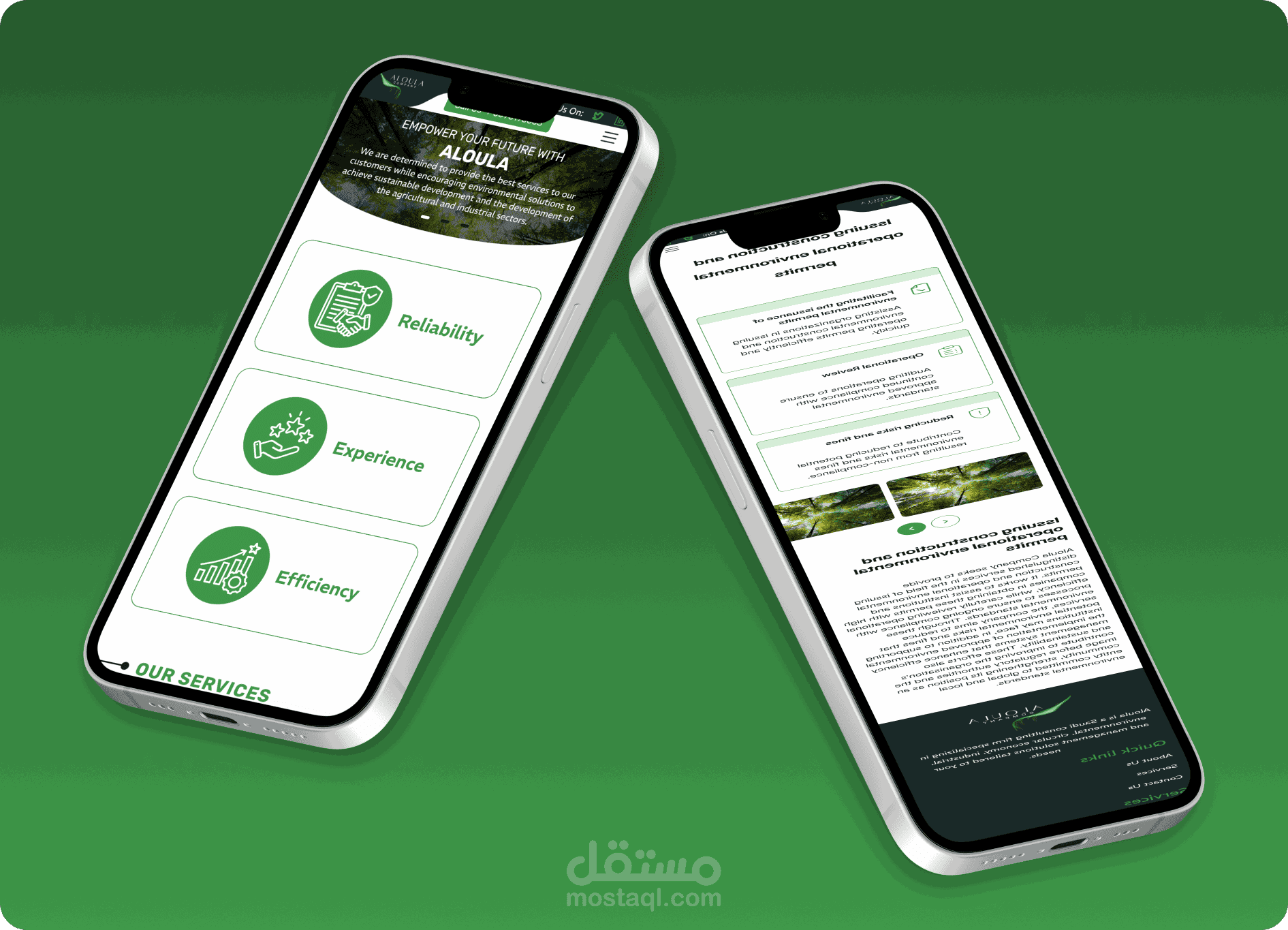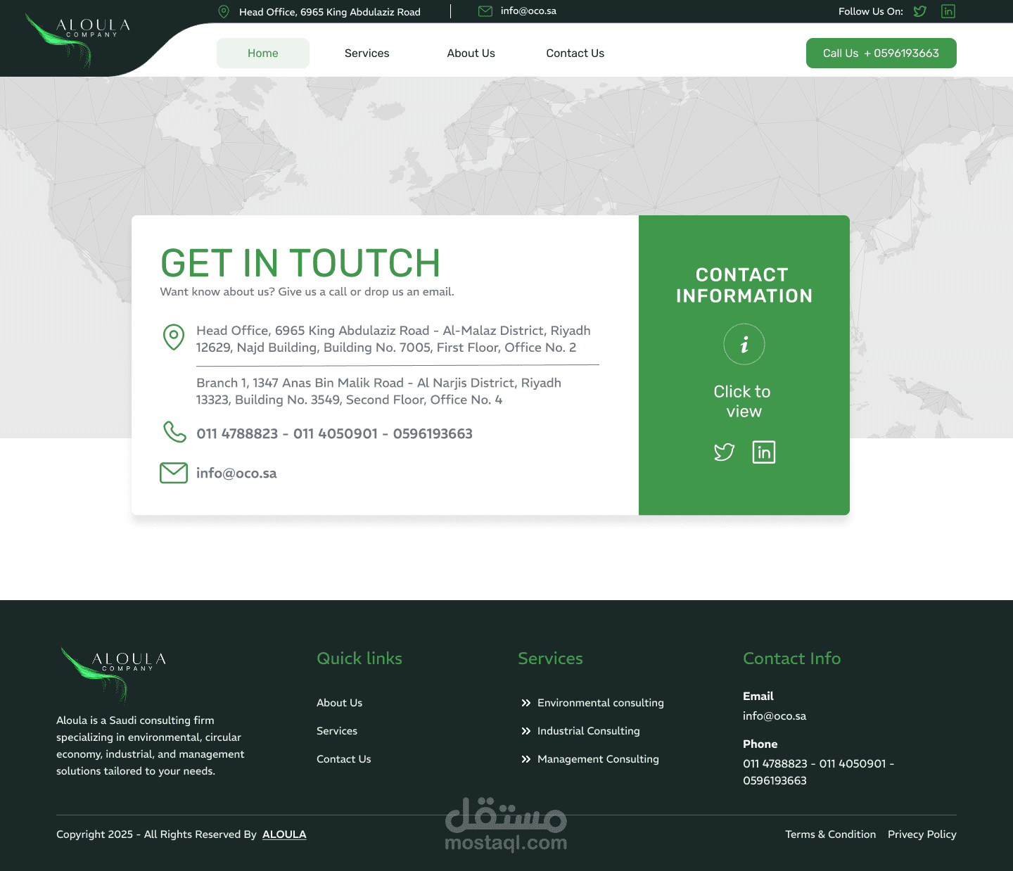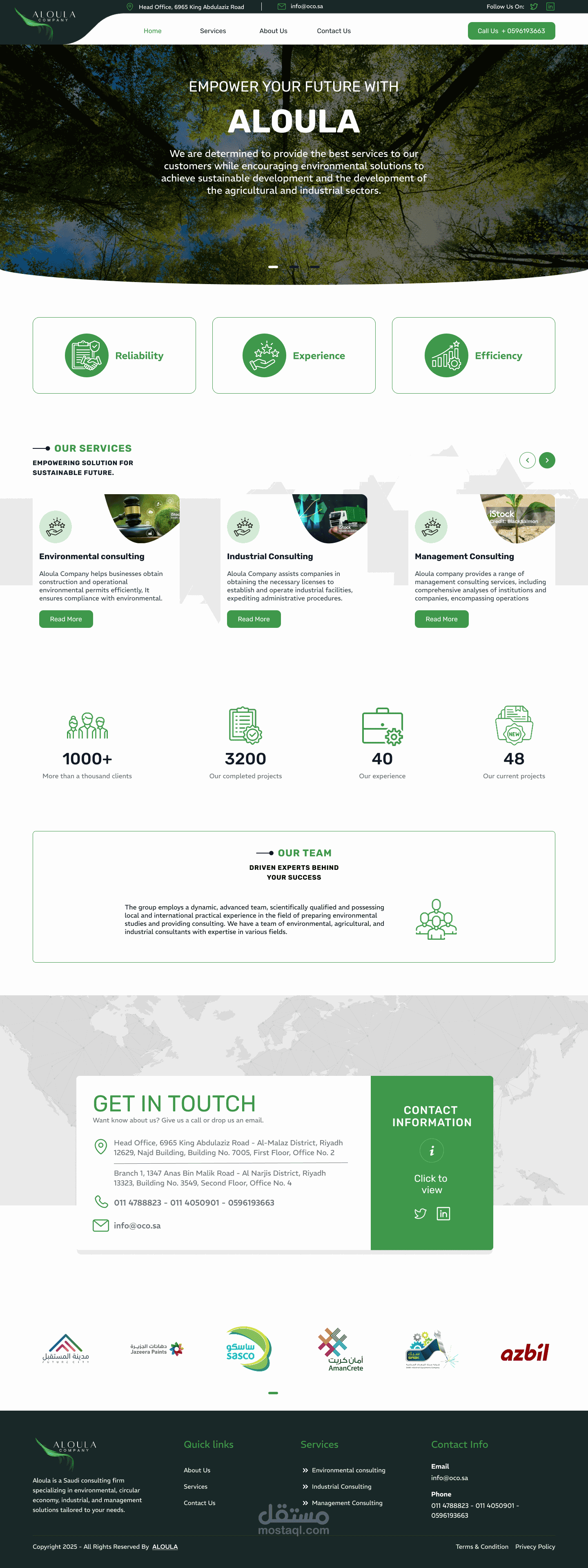 موقع إلكتروني حديث لشركة Aloula للاستشارات، يعكس ريادتها في مجال خدمات الاستشارات البيئية، والاقتصاد الدائري، والإدارية. ركّز المشروع على إنشاء منصة احترافية، سهلة الاستخدام، وسريعة الاستجابة، تُبرز خدماتها، وتُبرز خبراتها، وتتماشى بصريًا مع هويتها التجارية.
