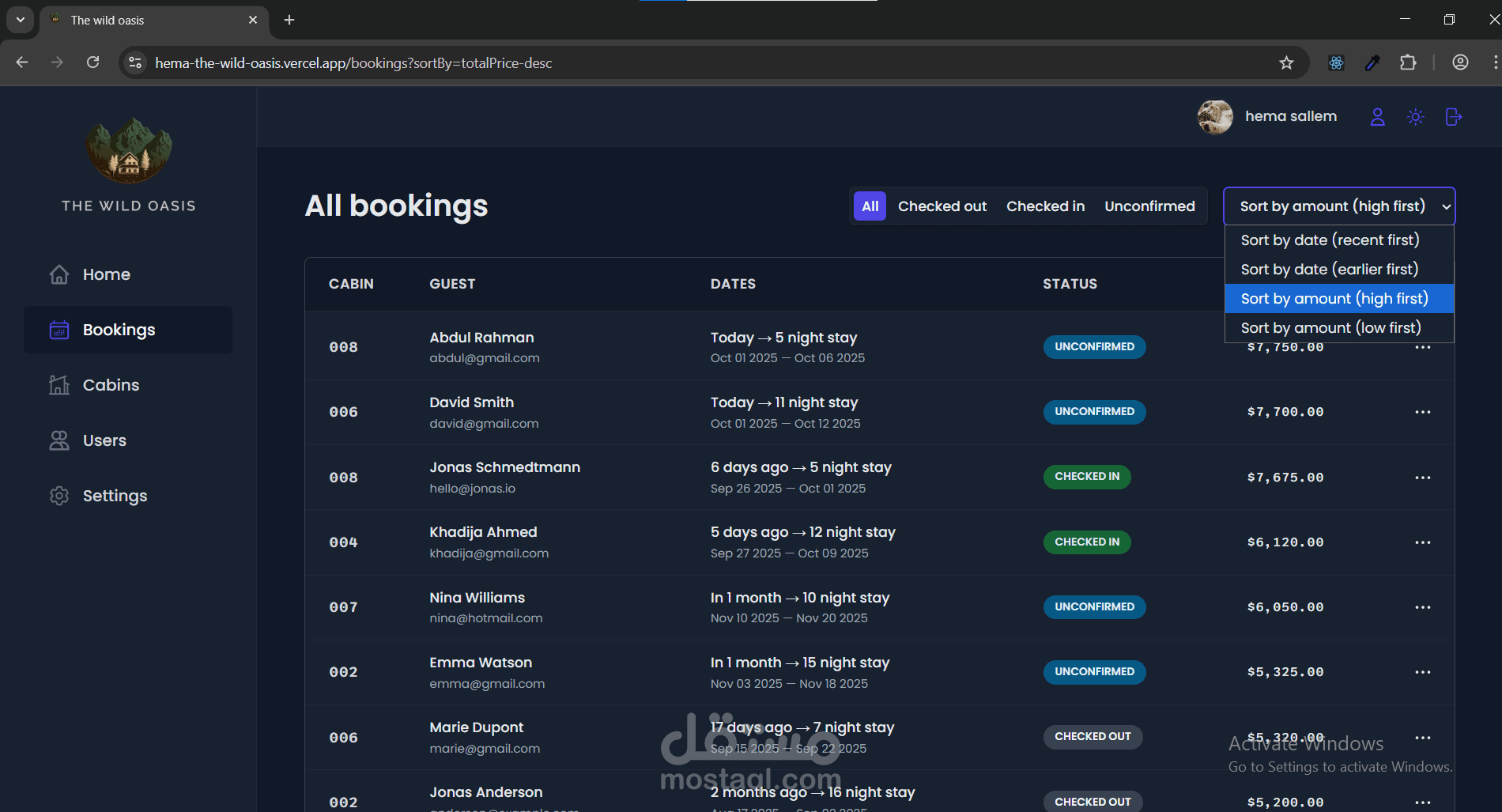 مشروع The Wild Oasis – لوحة تحكم لإدارة الحجوزات