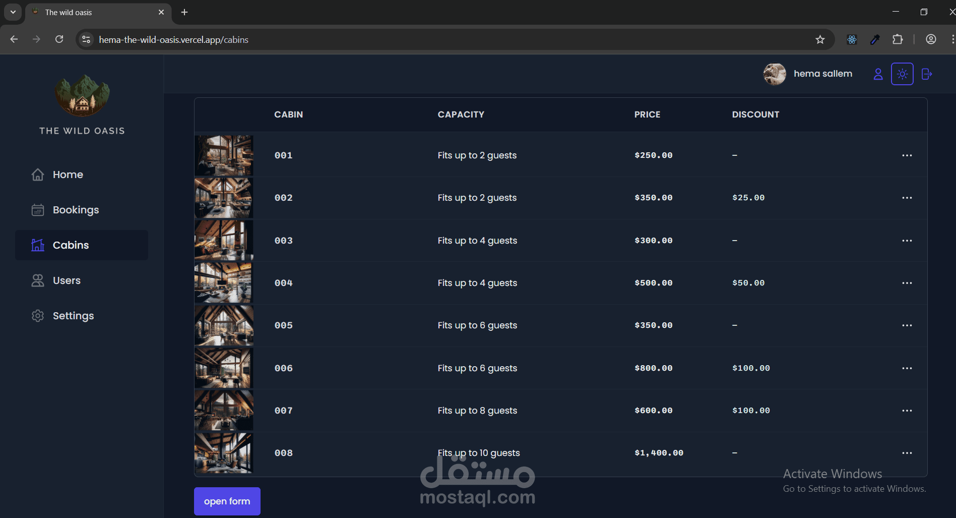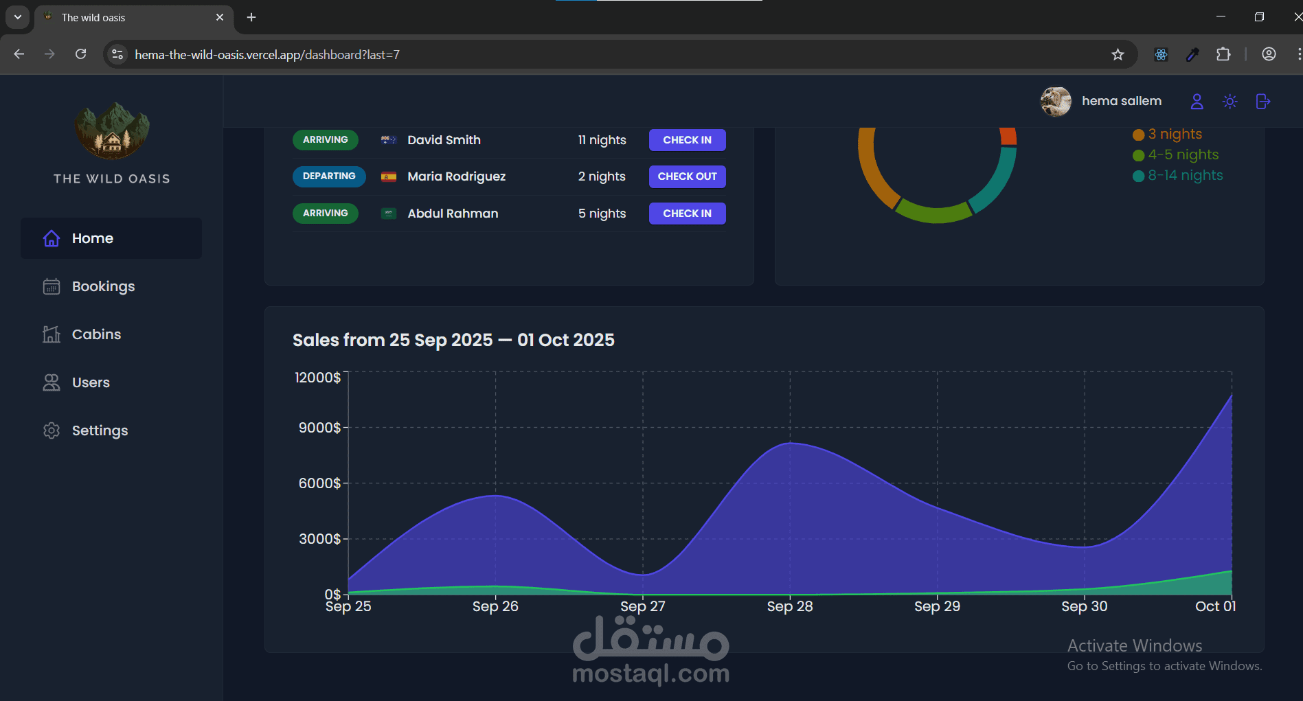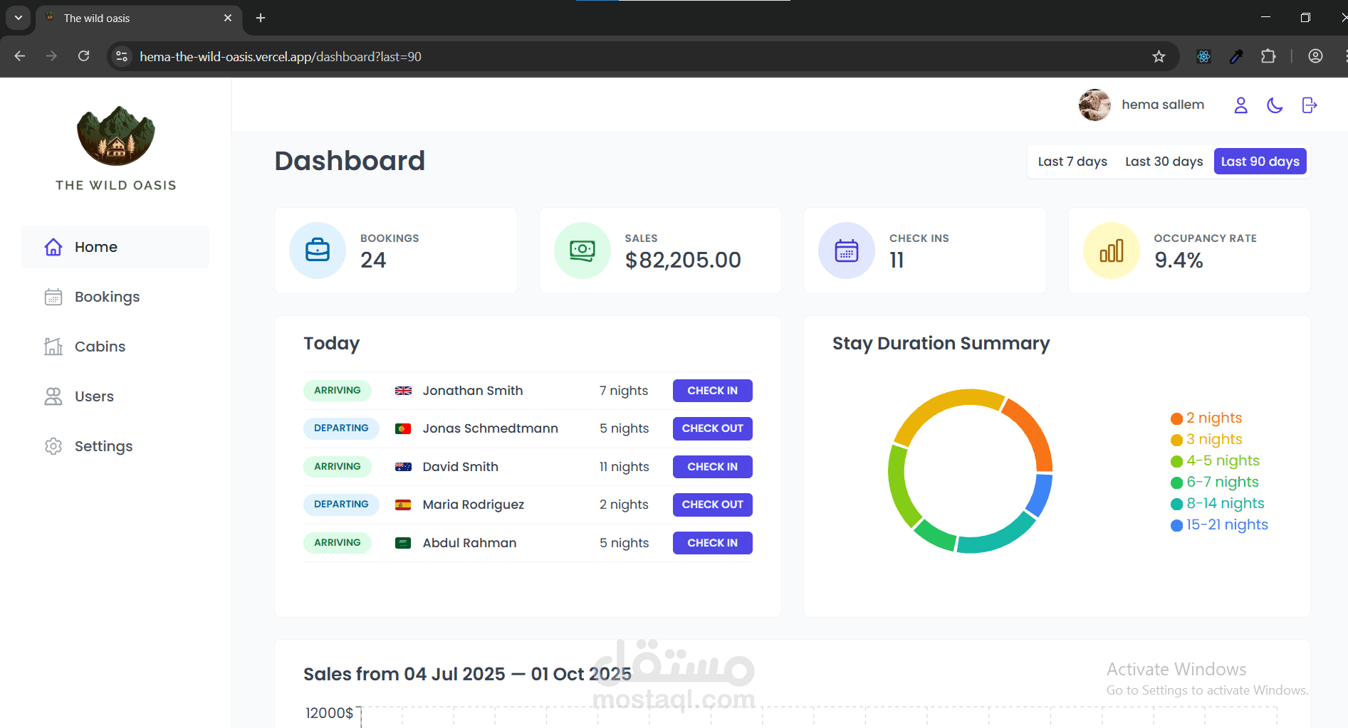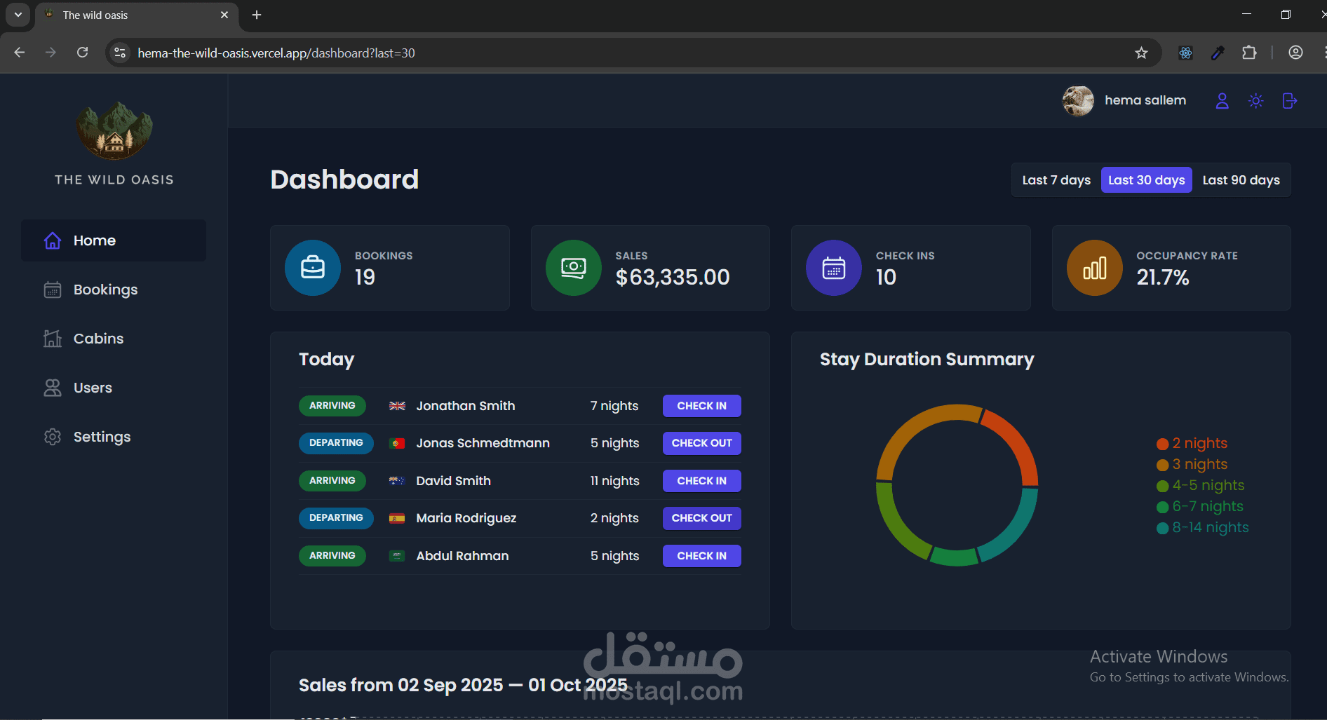 الوصف: "The Wild Oasis" هو تطبيق ويب متكامل لإدارة الحجوزات، تم تطويره باستخدام React وTypeScript، ويعتمد على مفهوم لوحة التحكم (Dashboard) لتوفير تجربة إدارة سلسة وفعالة. يتيح للمستخدمين إدارة الكبائن السياحية، تتبع الحجوزات، ومراقبة الإيرادات بطريقة منظمة وسهلة الاستخدام.