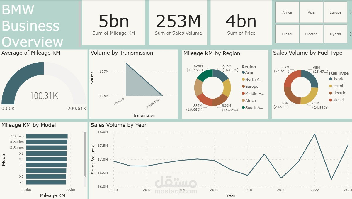 لوحة تحكم احترافية متكاملة لتحليل أداء أعمال شركة BMW عالمياً، تجمع بين التحليل العميق للبيانات والتصميم الأنيق، مع إمكانيات تفاعلية متقدمة تساعد في اتخاذ قرارات استراتيجية على مستوى المديرين التنفيذيين.
