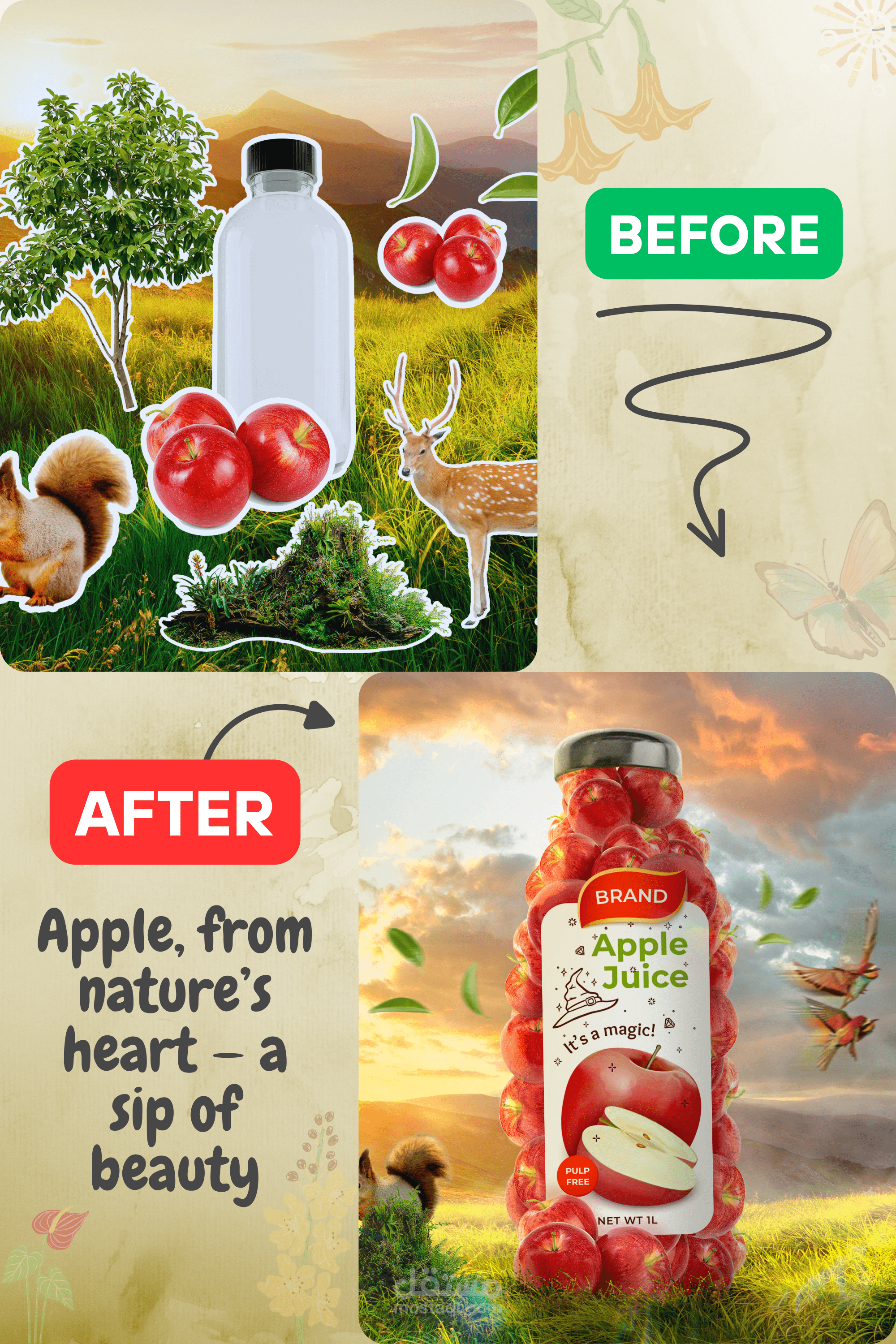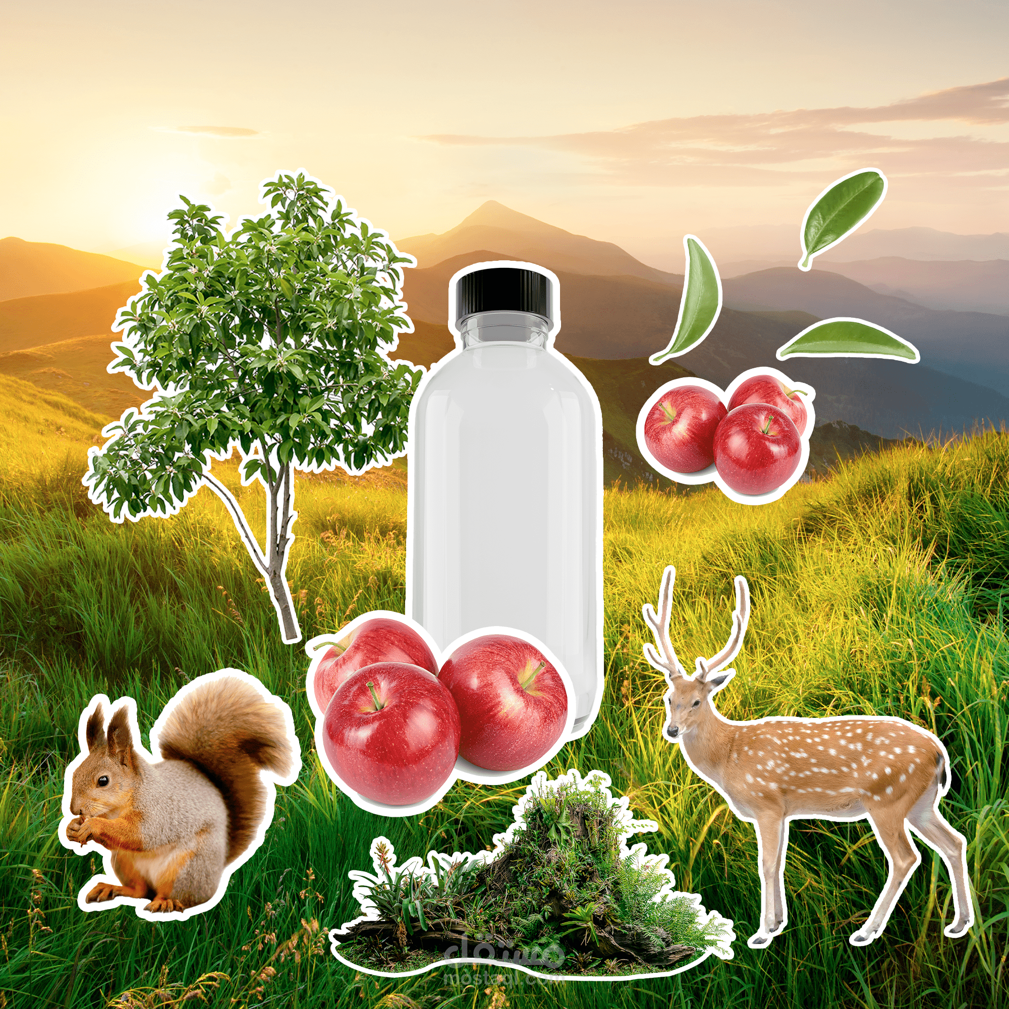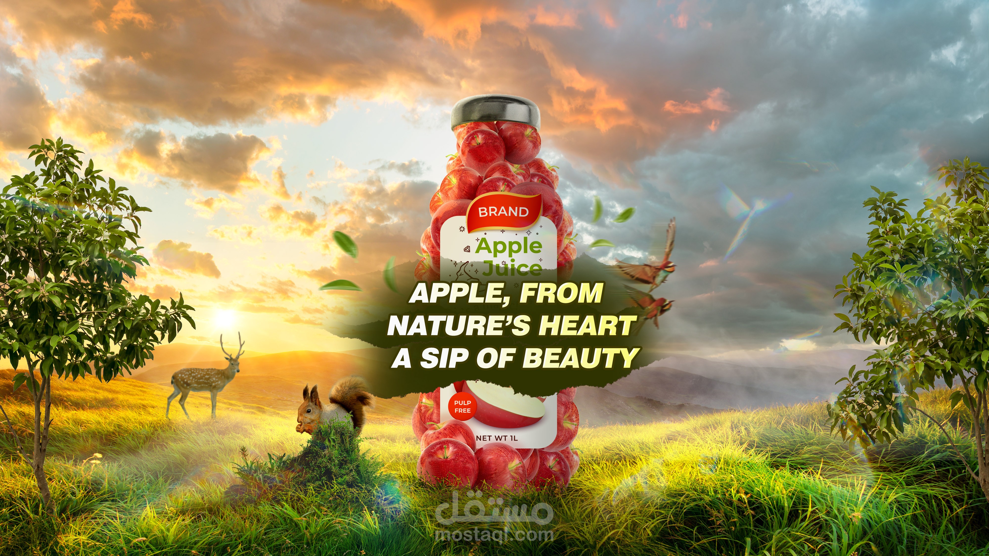 تصميم مستوحى من الطبيعة، يُبرز نضارة عصير التفاح في أجواء غابة خضراء.
