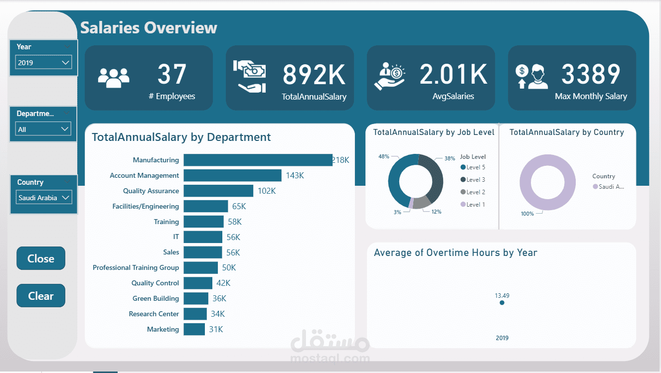 قمت بتحليل بيانات الموظفين والمرتبات كما هو موضح في أول صفحه داشبورد بتحتوي علي عدد الموظفين وتقسيمهم حسب الجنس ومتوسط سنين الخبرة ومشاهدة عدد الموظفين في كل قسم في الشركه وفي كل دولة ومعرفة كم عدد الموظفين في كل سنة