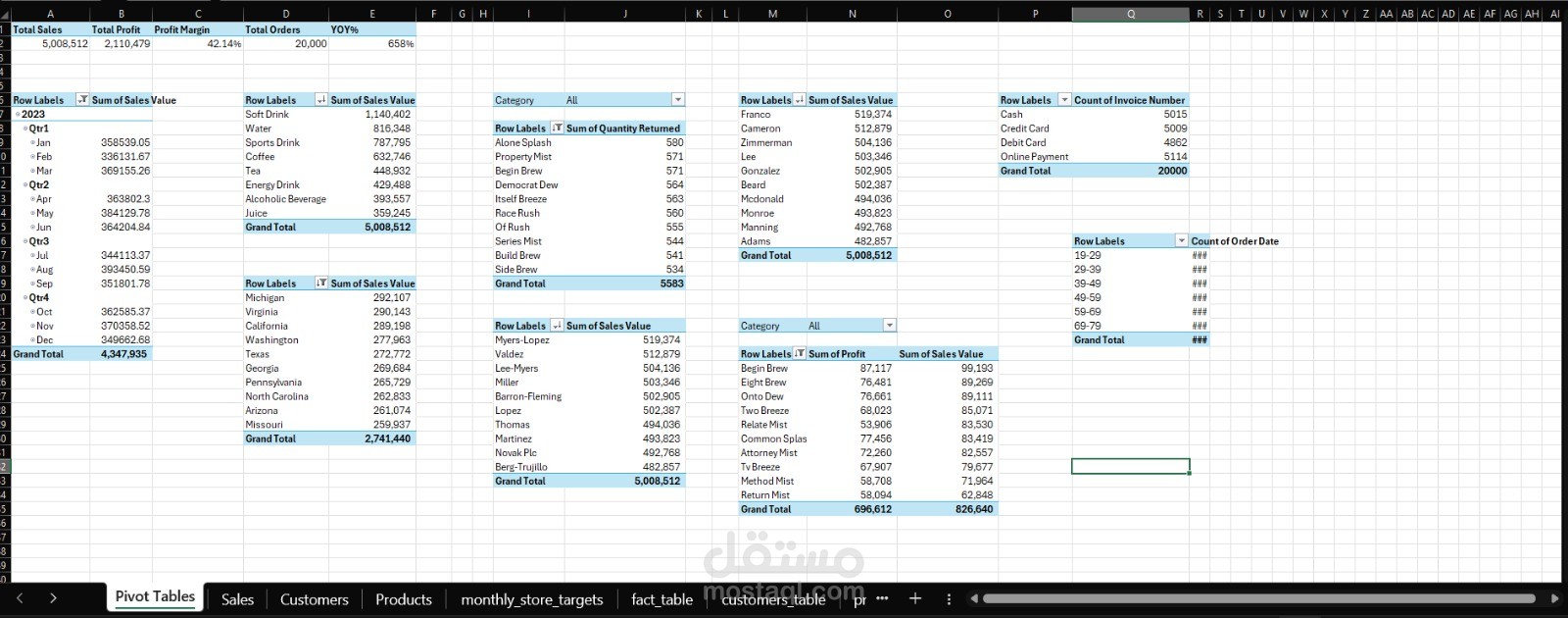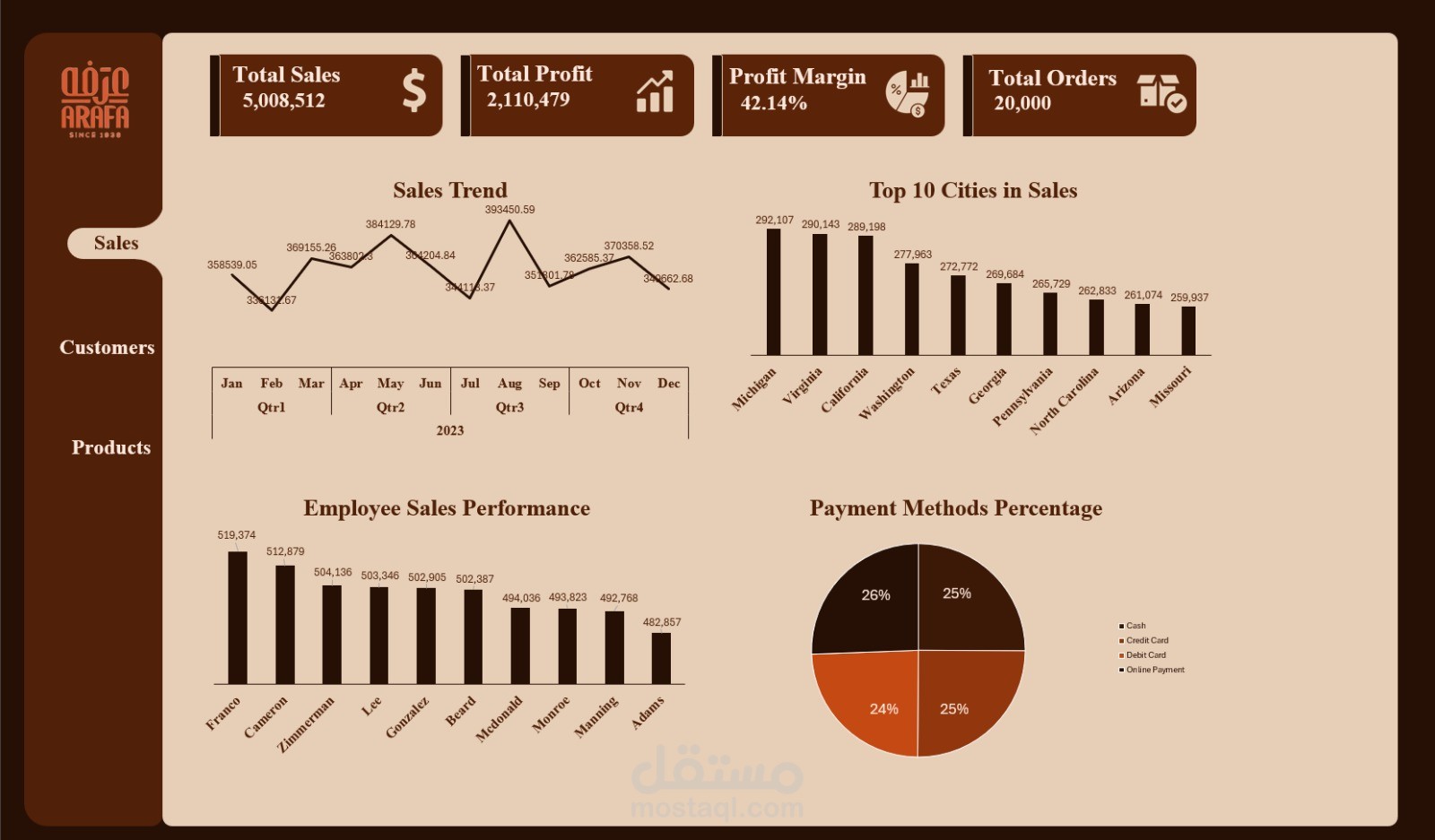 تصميم Dashboards تفاعلية تضم: اتجاهات المبيعات، أفضل المنتجات، توزيع العملاء حسب العمر والجنس والموقع، أداء الموظفين، وطرق الدفع.