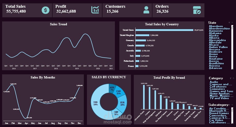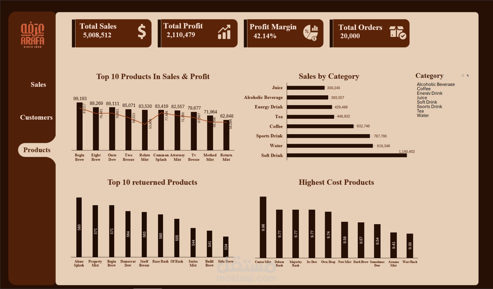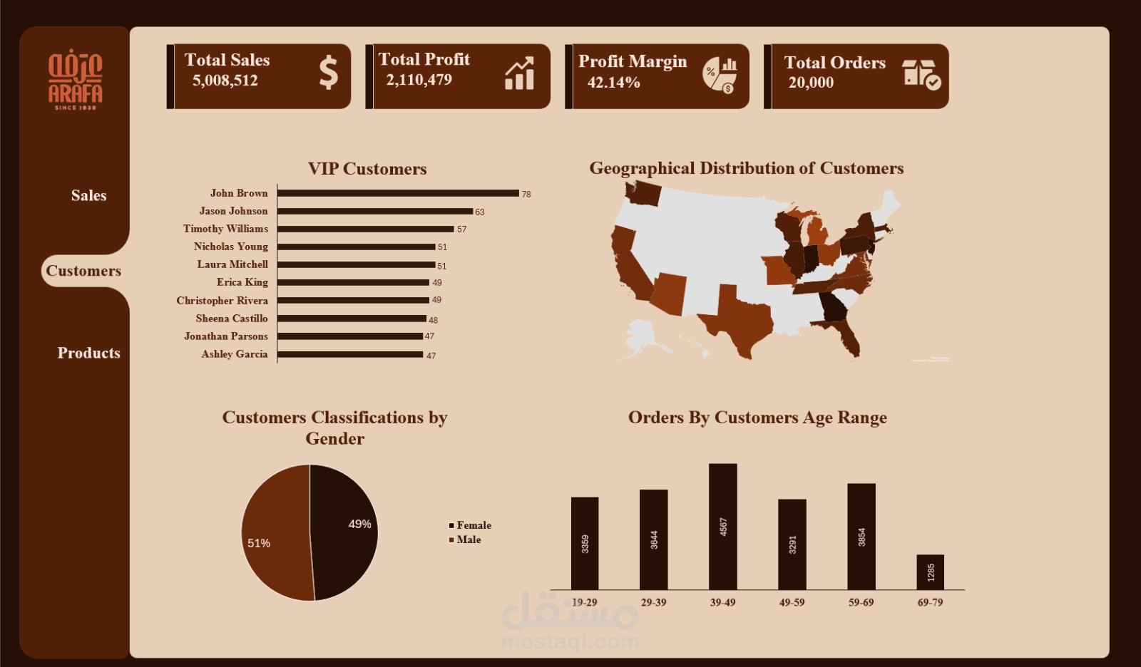 المشروع يشمل 3 لوحات معلومات رئيسية (المبيعات – العملاء – المنتجات) مرتبطة معًا بطريقة سلسة.