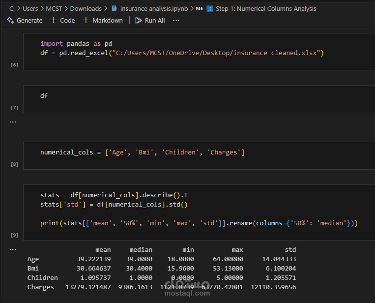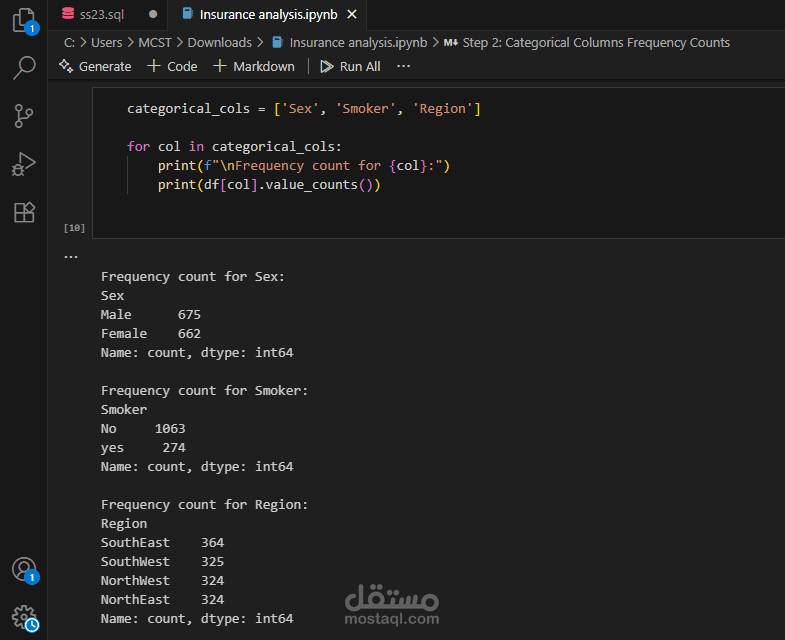 Used pandas to analyze numerical columns (e.g., Age, BMI, Charges) and count frequencies of categorical features (e.g., Sex, Smoker, Region) for initial data exploration.