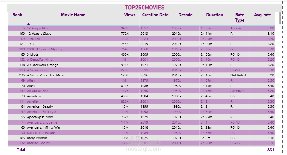Designed an interactive Power BI dashboard to explore the top 50 movies using key metrics: Rank, Movie Name, Views, Creation Date, Decade, Rate, Type, and Average Rate. Included a bar chart to visualize average rate ,movie by decade, helping users identify trends in film quality over time.