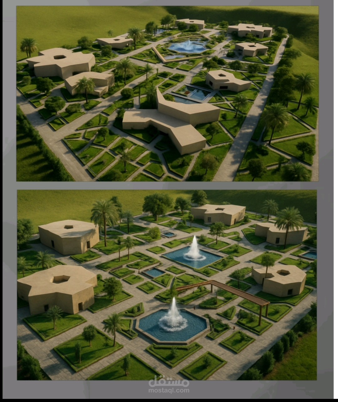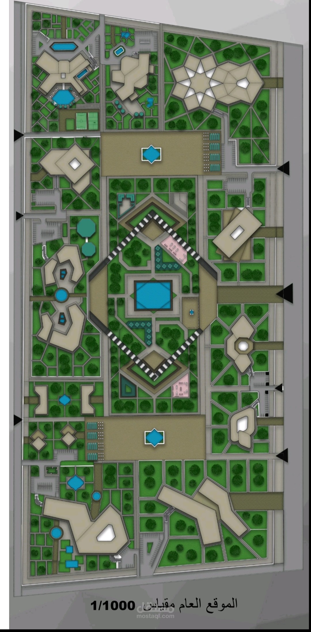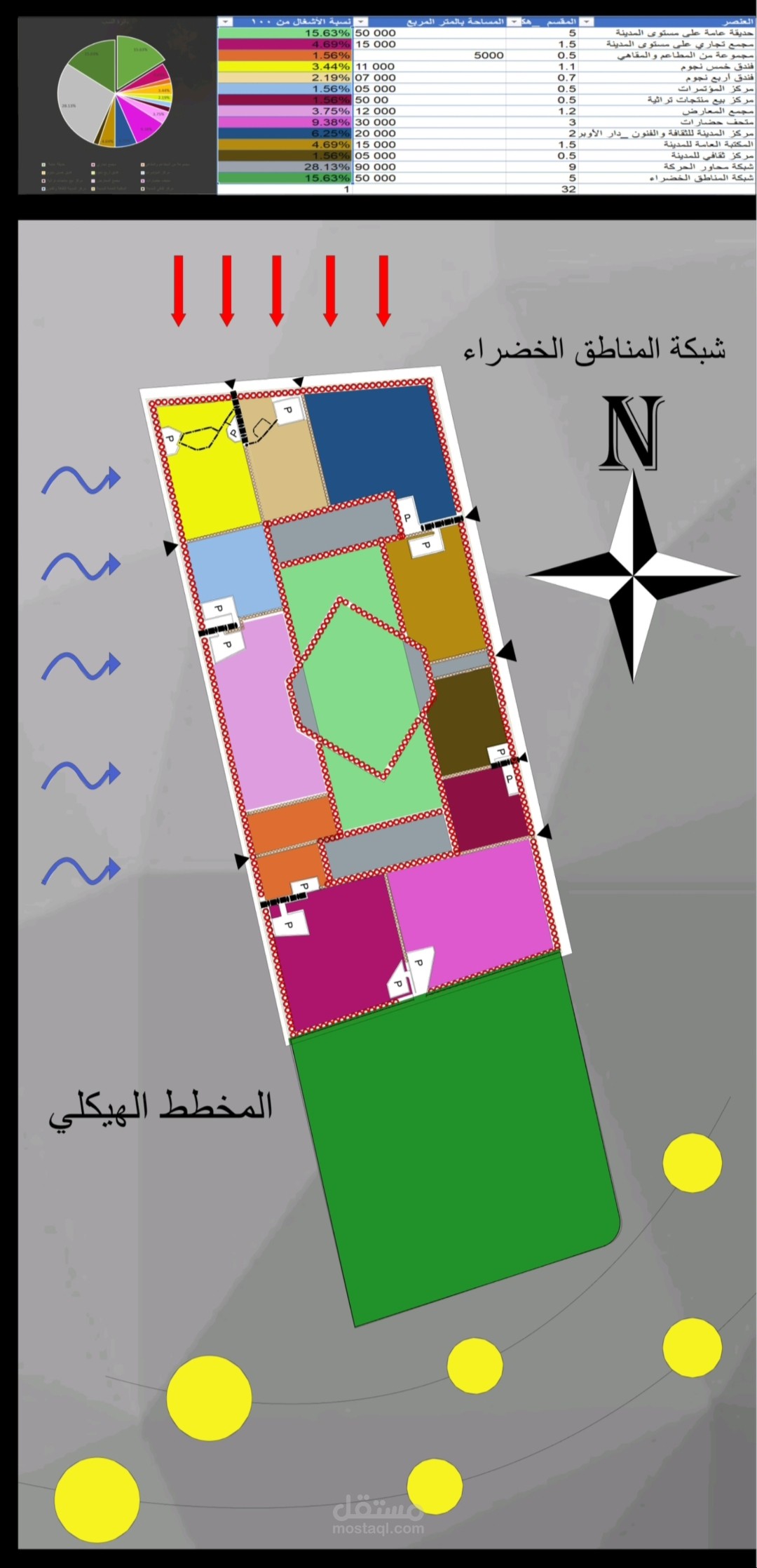دراسة تخطيطية شاملة لتوضع المباني مع المساحات الخضراء و المسطحات المائية و التوجيهات المختلفة للمباني ، بالإضافة الى جدولة النسب المئوية.