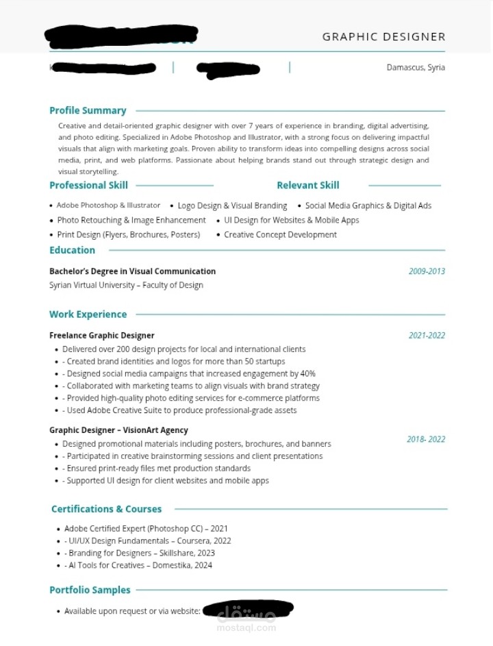 سيرة ذاتية متكاملة توضح خبرة المصمم في مجال التصميم الجرافيكي، مع أكثر من 7 سنوات من العمل في تصميم الشعارات، تعديل الصور، وإنشاء الهويات البصرية للشركات والمتاجر الإلكترونية.