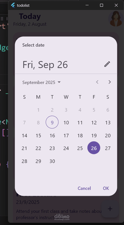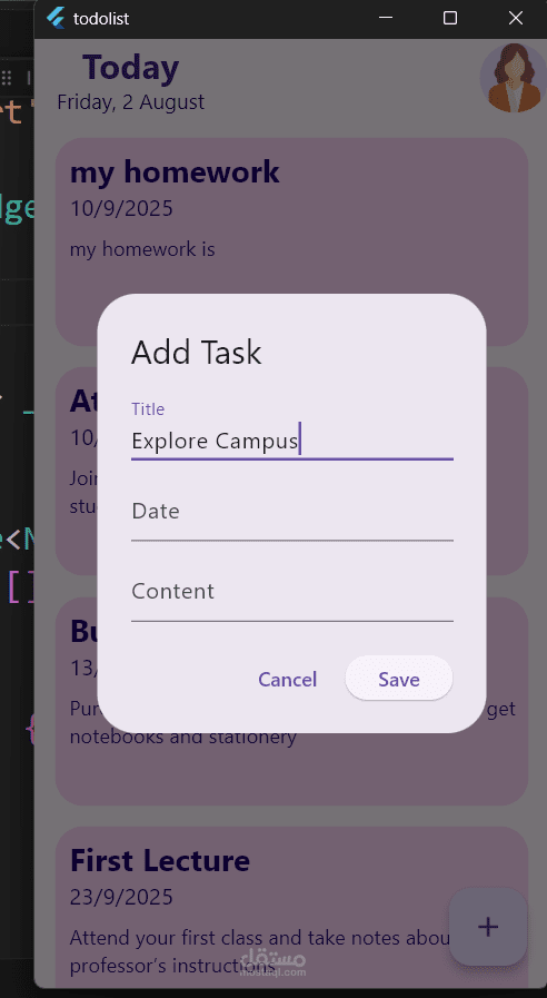 قمت بتطوير تطبيق بسيط لإدارة المهام اليومية باستخدام Flutter مع قاعدة بيانات محلية Hive لتخزين البيانات بدون الحاجة للإنترنت.