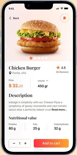صفحة تفاصيل الوجبة (صورة، مكونات، سعر، تقييم).