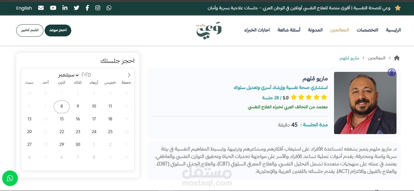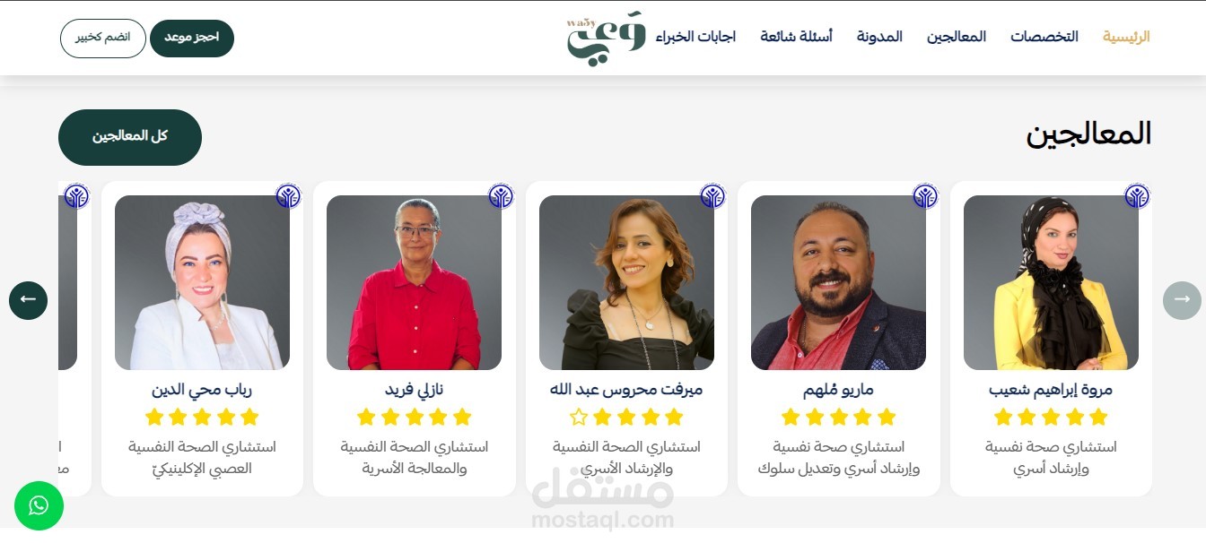 - صفحة خاصة لكل معالج تحتوي على بياناته، خبراته، وتخصصاته لمساعدة المستخدم على اختيار الأنسب له.