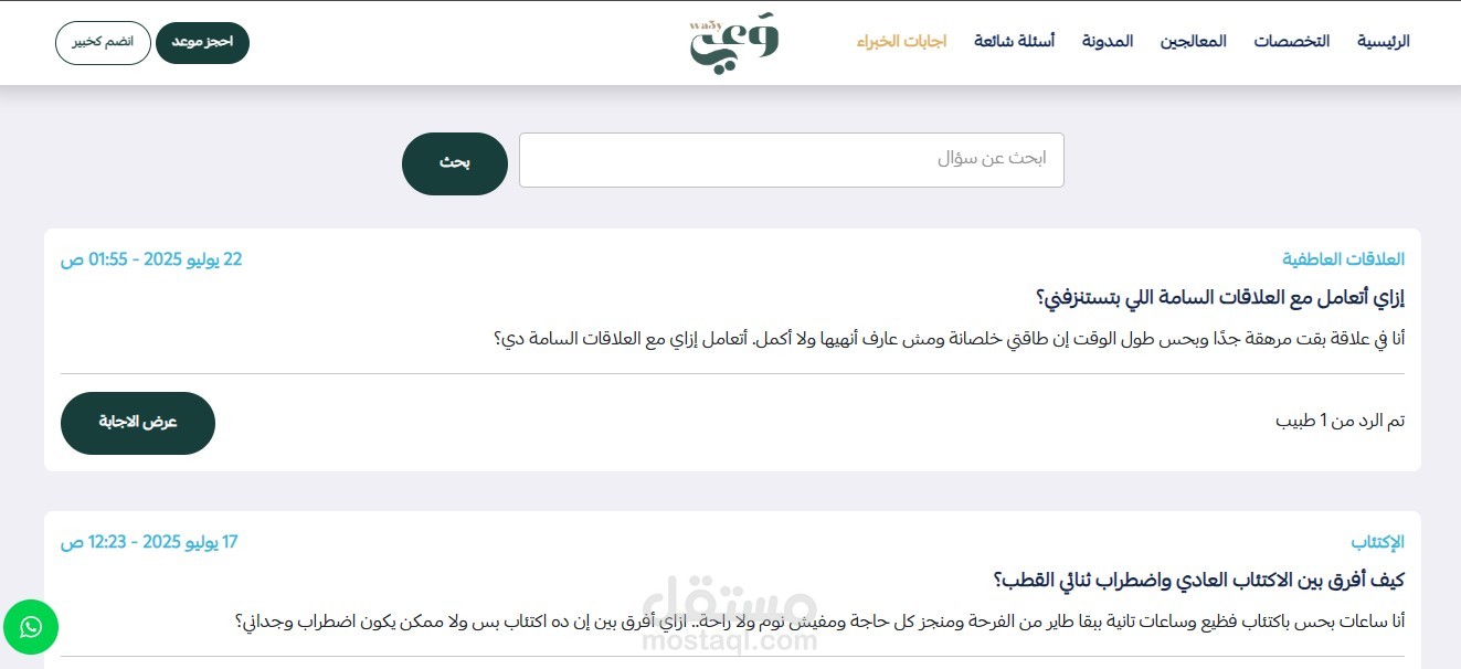 - يمكن الوصول إلى هذا القسم من صفحة الأسئلة الطبية، حيث يحصل المستخدم على إجابات موثوقة من خبراء معتمدين.