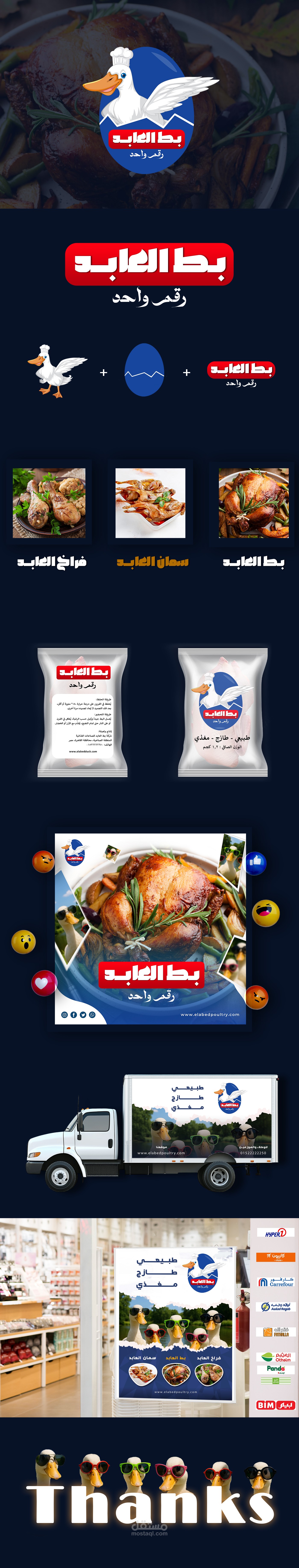 بط العابد علامة متخصصة في إنتاج البط الطازج بجودة عالية. صُمّمت هويته البصرية لتعكس الثقة والموثوقية بألوان طبيعية وشعار بسيط ومعبر، تمتد تطبيقاته من الأغلفة إلى السوشيال ميديا ليمنح العلامة حضوراً قوياً وهوية متكاملة تظل راسخة في ذهن المستهلك.
