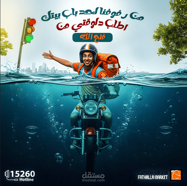 صممت هذا الإعلان الإبداعي للترويج لخدمة التوصيل من فتح الله ماركت، حيث ركزت على الدمج بين الواقعية والخيال لإيصال الرسالة بطريقة مبتكرة وجذّابة. يظهر في التصميم مندوب التوصيل على دراجته وكأنه يقطع المسافات ويتحدى العقبات ليصل بسرعة للعميل، وهو ما يعكس التزام العلامة التجارية بالوصول إلى الزبائن في أي وقت وأي مكان.