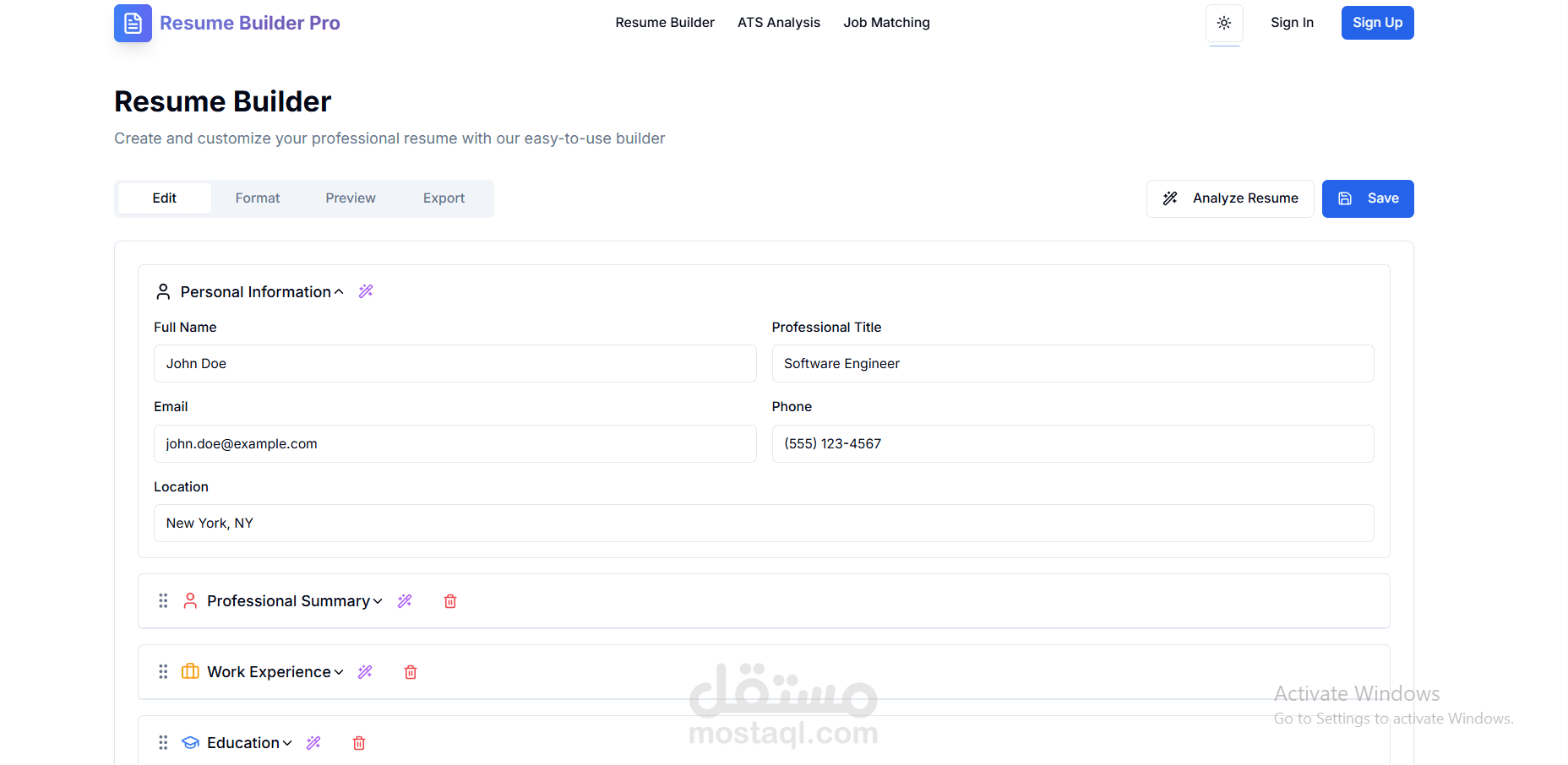 منشئ السيرة الذاتية (Resume Builder): يوفر قوالب احترافية قابلة للتخصيص مع خطوات إرشادية تساعد المستخدم على إعداد سيرة ذاتية منظمة واحترافية بسهولة.