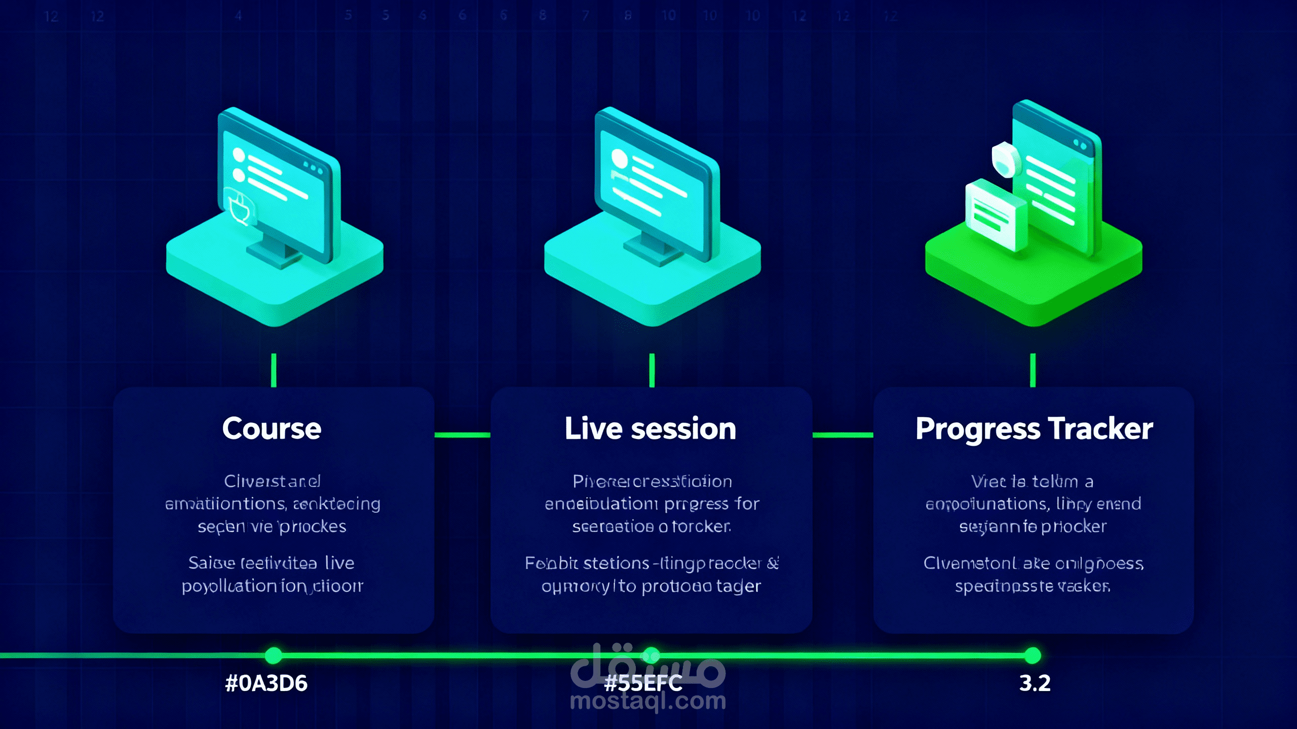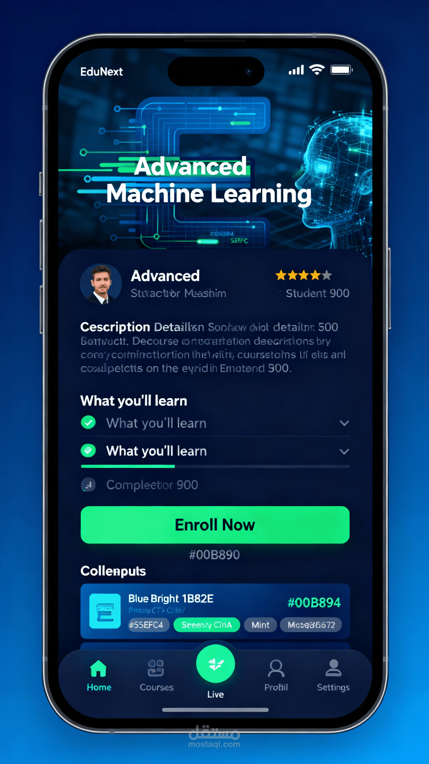 - تصميم شاشات لتطبيق الموبايل (تسجيل الدخول، لوحة التحكم، صفحة تفاصيل الدورة).
