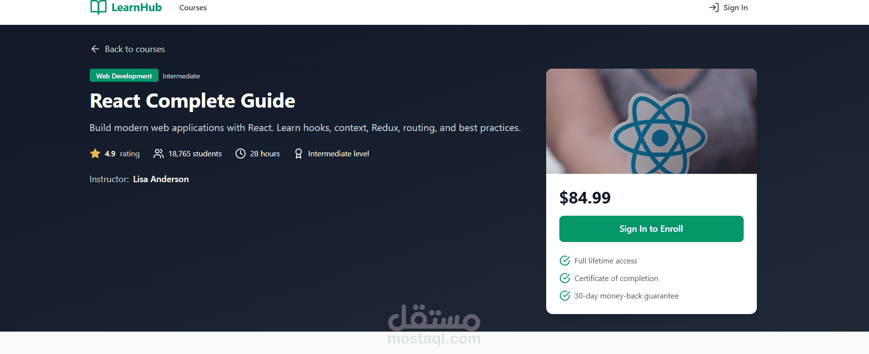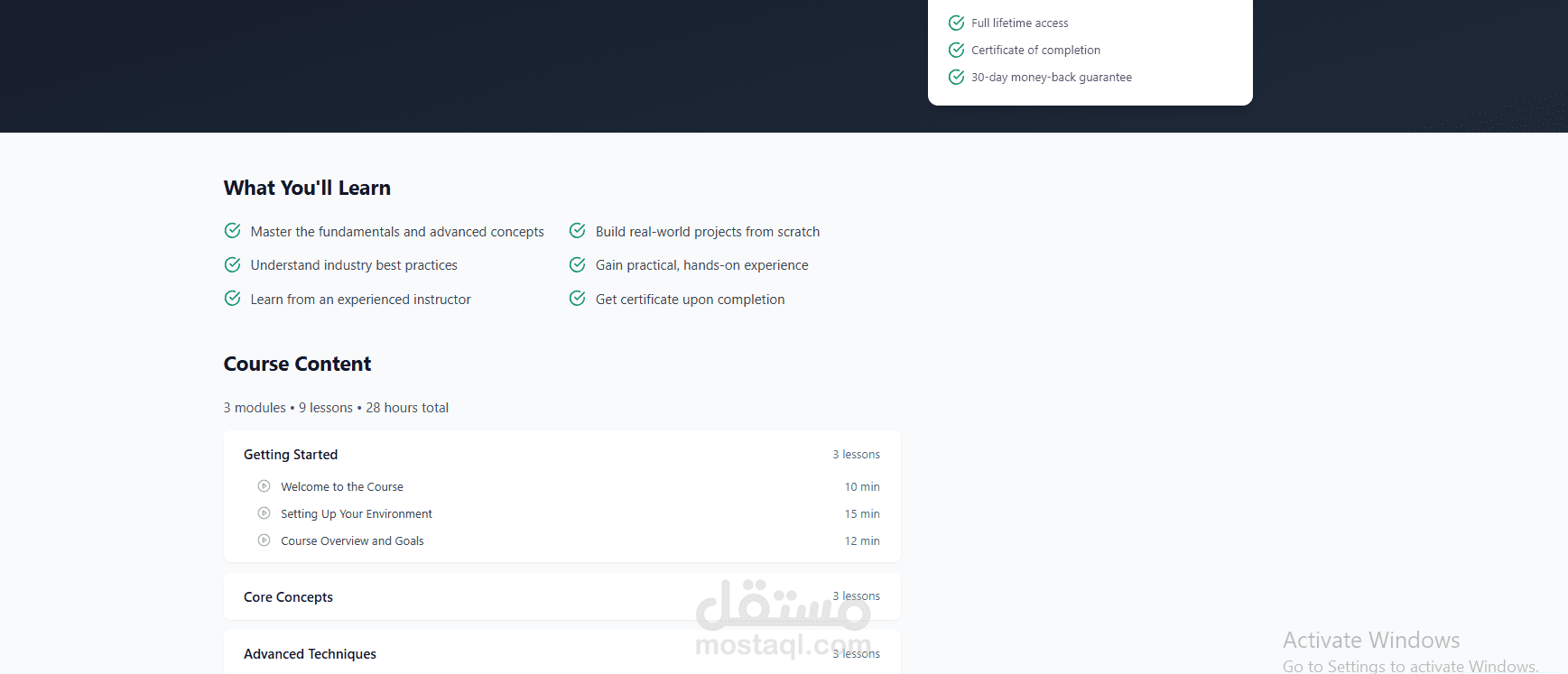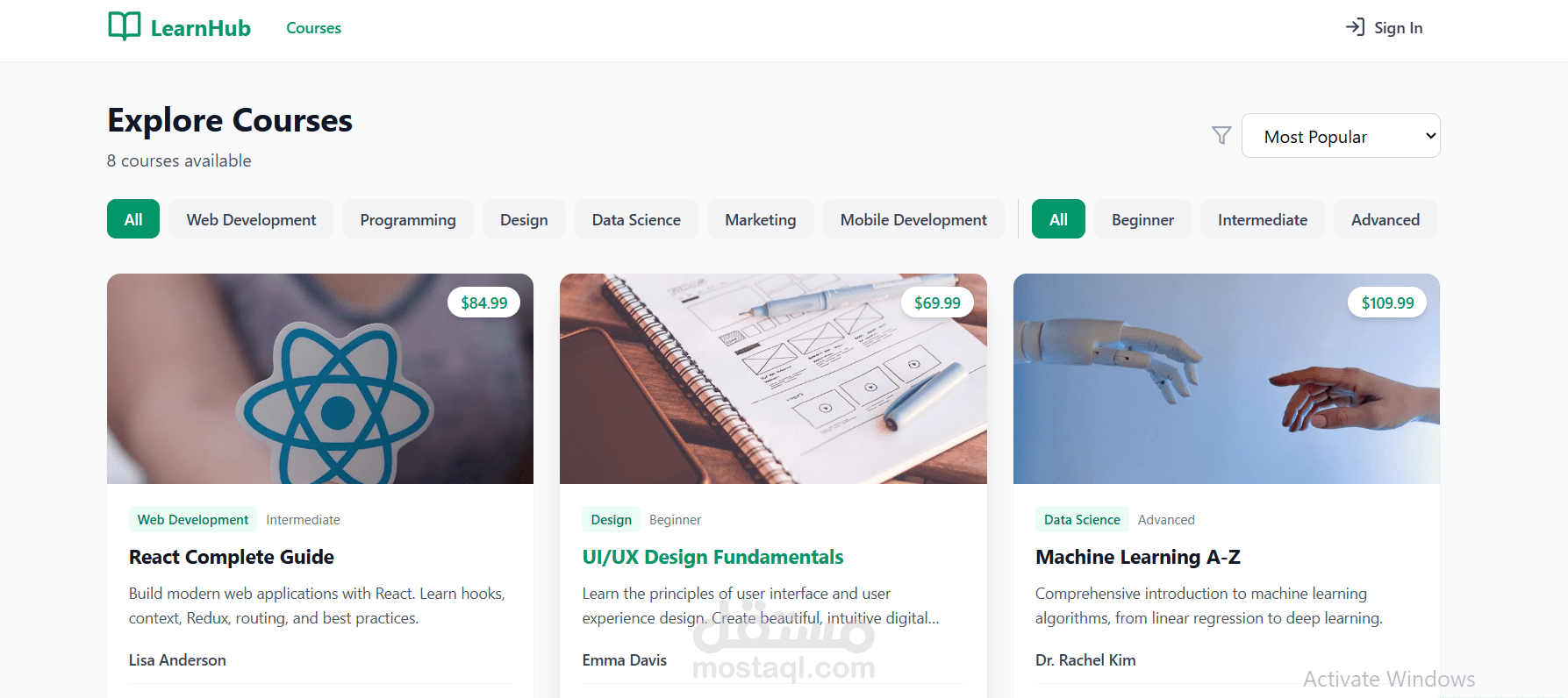 يهدف هذا المشروع إلى إنشاء منصة تعليمية عبر الإنترنت تتيح للمتعلمين الوصول إلى مجموعة واسعة من الدورات التدريبية في مختلف المجالات. توفر المنصة بيئة تعليمية تفاعلية تساعد على تطوير المهارات وزيادة المعرفة بشكل مرن ومناسب لاحتياجات المستخدمين.