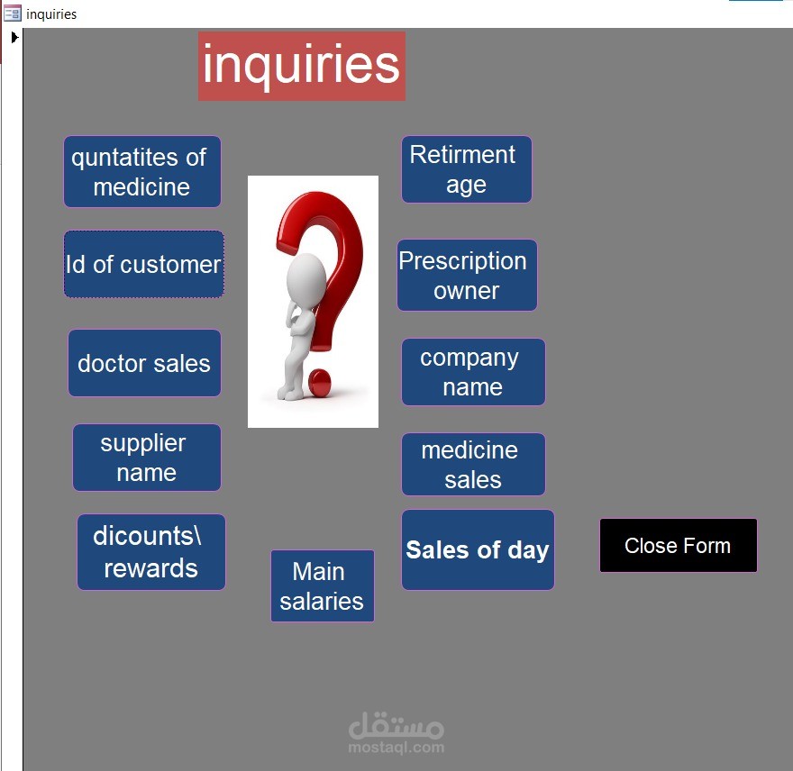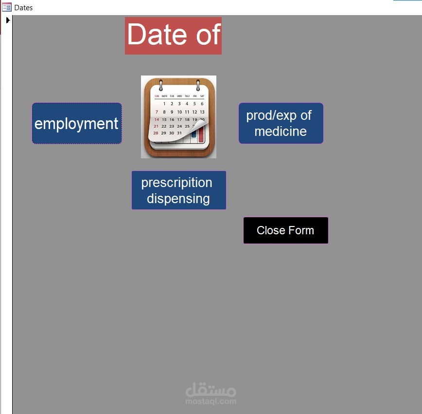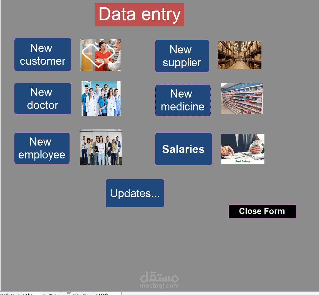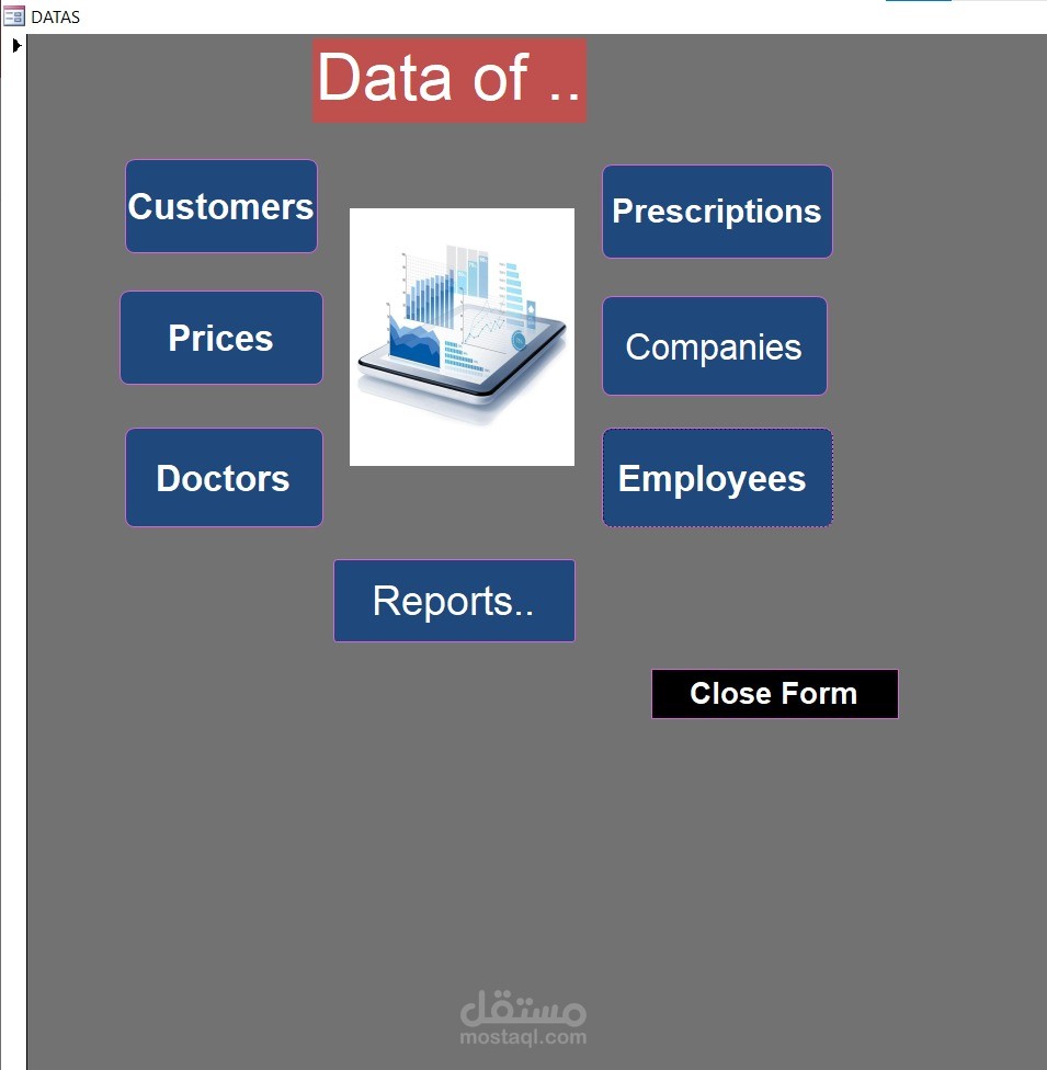 المشروع عبارة عن قاعدة بيانات (Database System) مصممة ببرنامج Microsoft Access لإدارة الصيدلية بشكل منظم بدل الطرق اليدوية.