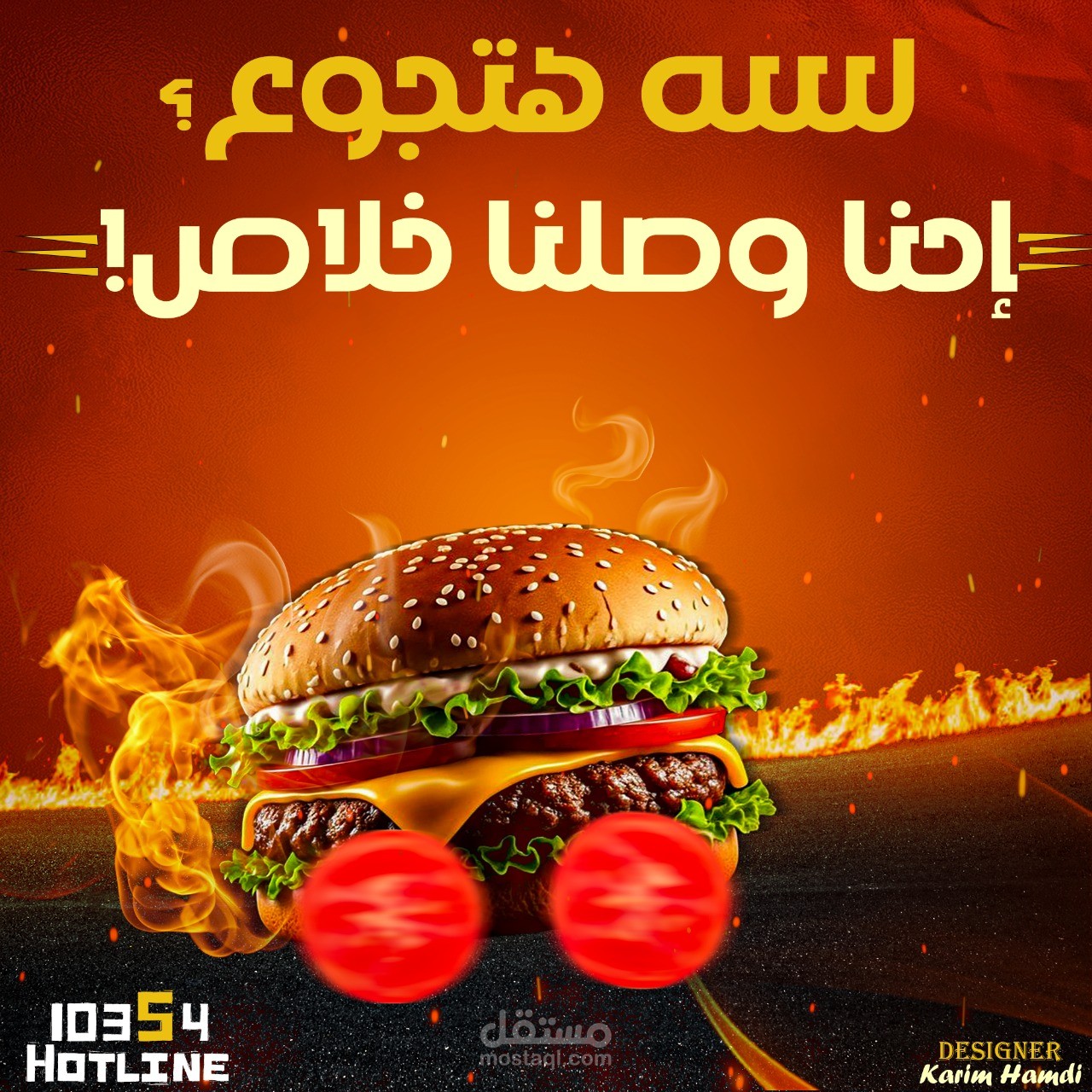 الفكرة بتجسد البرجر على شكل سيارة سريعة بإطارات نارية، مع خلفية نارية وحركة ديناميكية تعبر عن السرعة في التوصيل.